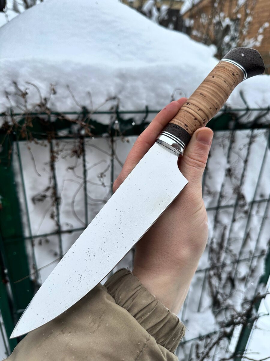 Сталь не требует к себе никакого ухода, прочная на излом и долго держит заточку. Рукоять на ноже выполнена из бересты. Нож режет как бритва. Твердость клинка (HRC): 58 Цена за нож: 7.560 рублей. В комплекте идут ножны из натуральной кожи. Можем сделать формованные ножны +8000 рублей. Для заказа писать на @Nazarklinokbot или по тел +79101343831 WhatsApp/Viber