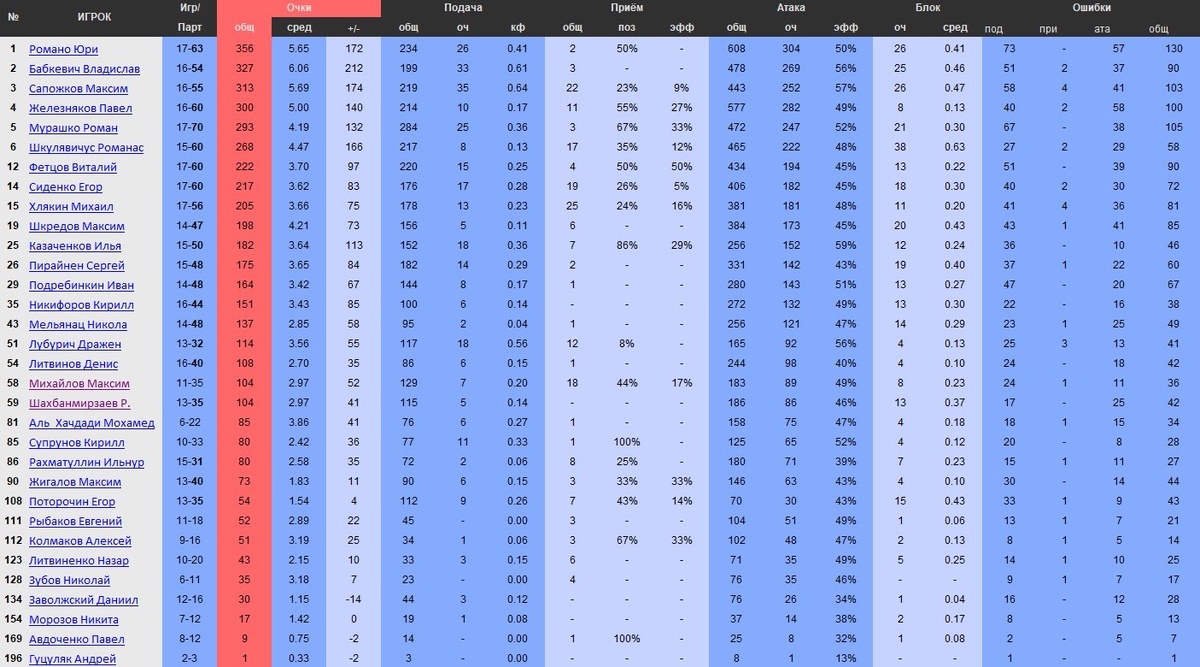 Например, наш диагональный за 20 матчей принимал 25 раз и дал 48% доводки при всего 2 ошибках. На этом фоне стало интересно как обстоят дела с приемом у диагональных в российской Суперлиге. Самые принимающие тут Хлякин и Сапожков, однако по позитивной доводке обе не дотягивают и до 25%. А вот 86% позитива от Казаченкова выглядят устрашающими, но у него всего лишь 7 приемов. Хорошо справляются с подачей соперника Железняков и Максимов. Второй казанский диагональный Лубурич при 12 попытках довел всего лишь 1 мяч. А как там дела в Европе?! Главный бомбардир итальянской А1 Реггерс в 15 матчах принимал.. 49 раз. Отличными цифрами похвастаться он не может (50+% ошибок и выбитых мячей), но тем не менее активно участвует в приеме. А вот у Бен Тары, например, за 15 матчей всего 3 приема. В польской Плюс-лиге у лидеров списка бомбардиров Индры и Рыхлицки по 9 и 14 приемов, соответственно. А вот идущий третьим Насевич за 28 приемов дал 43% позитивной доводки. В Турции Хесус Эррера принимал всег