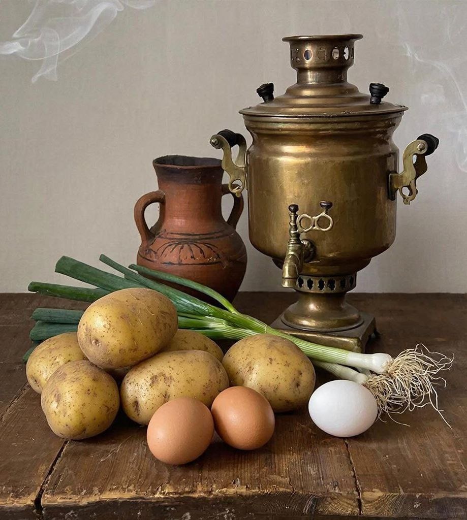 Следующим этапом был самовар. Решили, что надо кипяток отлить в чугунок, а то уж очень тяжел самовар. К самовару, за ручки ,привязали веревки, которые весели в сарае. Тянули на крышу втроем, а двое внизу поднимали и держали, пока доставали руки. Самовар раскачивался из стороны в сторону, но мы все же удержали его, и подхватив за показавшиеся ручки, затянули на крышу. Довольные и уставшие, мы подняли еще две табуретки и скамейку. Я принесла праздничную скатерку, которая лежала у нас в шкафу. Мы накрыли стол и чинно уселись вокруг. День был солнечный, теплый, но на крышу сеней уже не падали его лучи, а легкий ветерок хорошо обдувал наши разгоряченные лица и тела. Мы стали трапезничать и обсуждать деревенские новости.