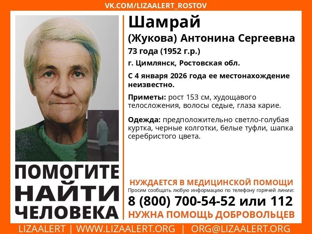 4 января 2026 года в 23:50 в поисково-спасательную службу «ЛизаАлерт» поступило сообщение о пропаже Антонины Сергеевны Шамрай (Жуковой), 1952 года рождения. Заявка была немедленно принята в работу, и добровольцы начали активно собирать информацию о местонахождении женщины. Однако, несмотря на все усилия, поиски до сих пор не увенчались успехом. В «ЛизаАлерт» подчеркивают, что любая информация, которая может помочь в поиске Антонины Сергеевны, будет принята с большим вниманием и может стать решающей для её спасения. Поиски продолжаются. ВЕСТНИК ВОЛГОДОНСКА