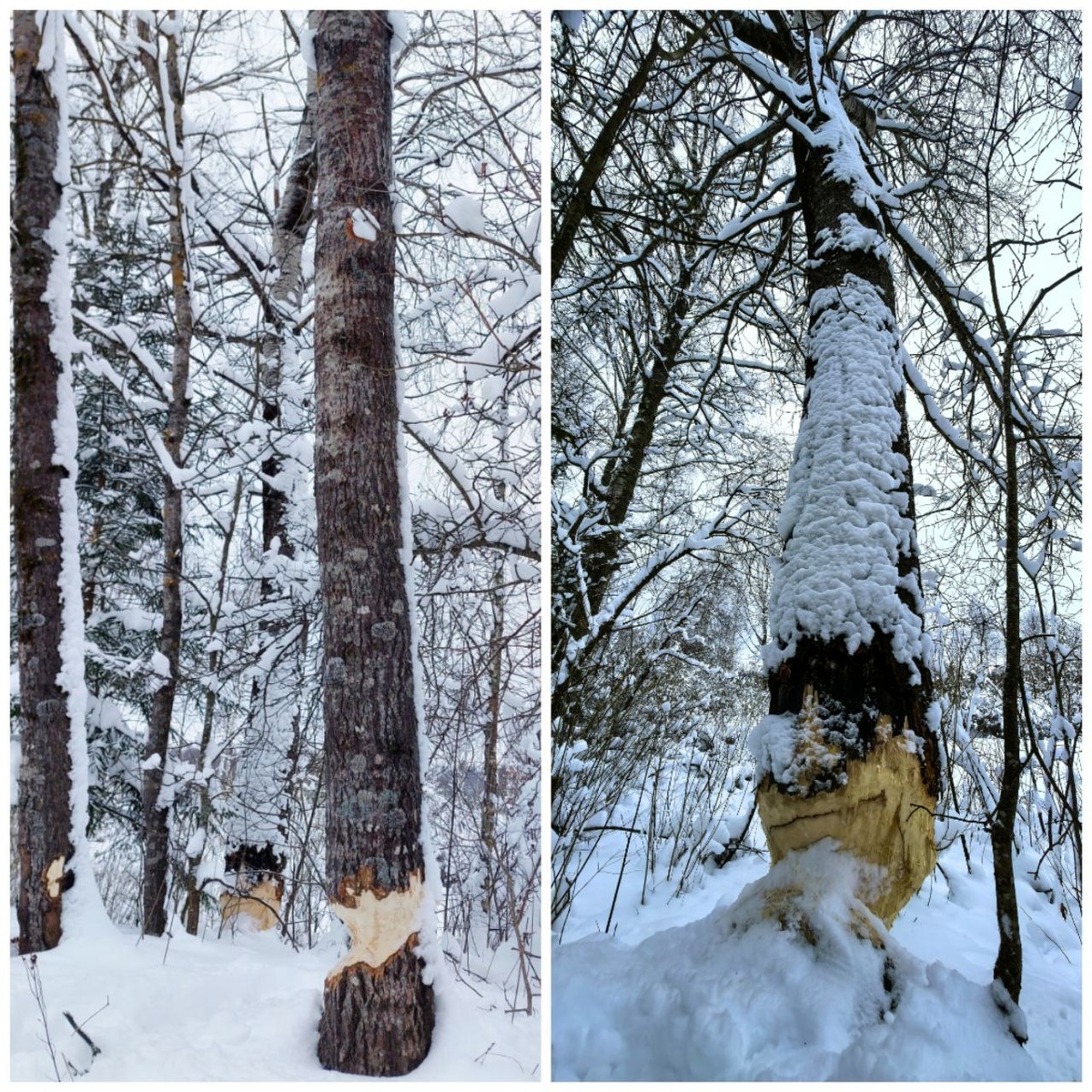 В зимнем походе в Бородино мы встретили плоды творчества очень целеустремленного местного жителя. Диаметр самого большого дерева у основания — почти метр! А бобер ли это? 😄