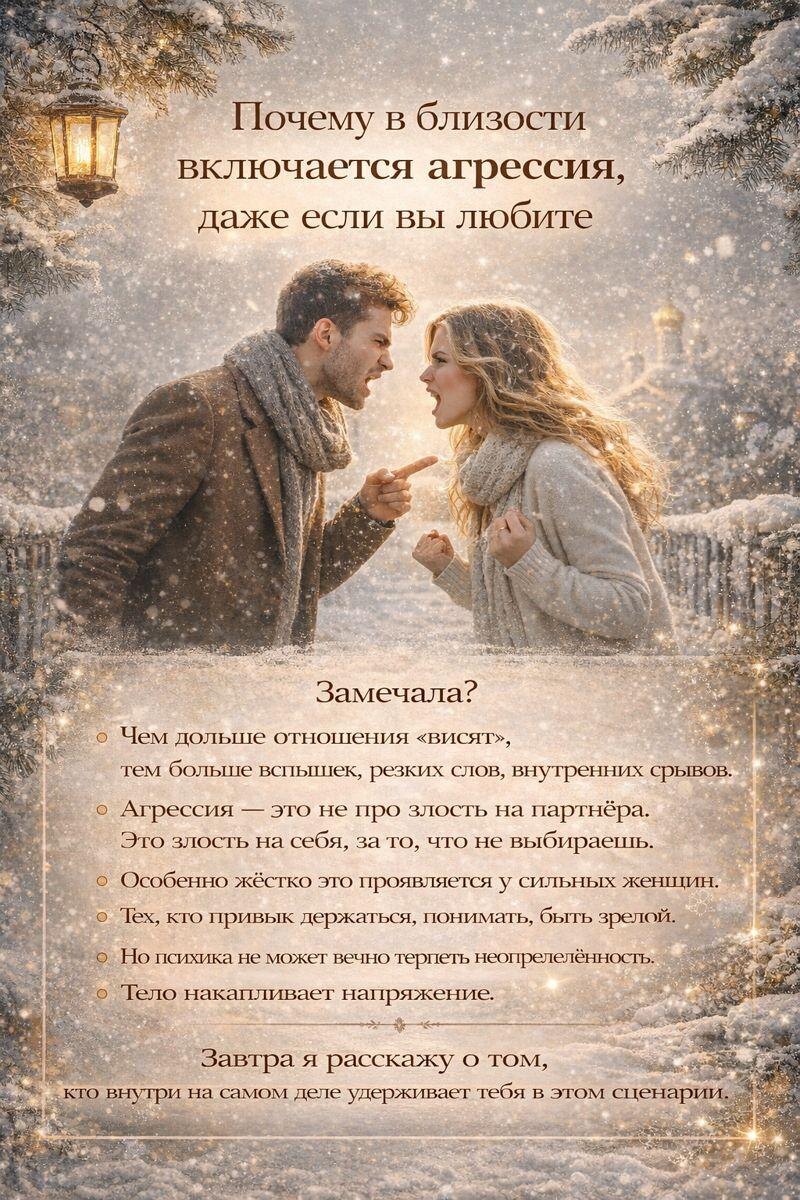 Замечала? Чем дольше отношения «висят», тем больше вспышек, резких слов, внутренних срывов. Агрессия — это разрушающая низко вибрационная программа и она не про злость на партнёра. Это агрессия и злость на себя, за то, что не выбираешь себя в этот момент, а выбрала низкие частотные программы разрушения и позволяешь им тобой управлять - тут уже энергетический тонкий план Завуалировано здесь, якобы "Он не Выбирает Тебя" - это поверхность, то что видно - обычная психология. Особенно жёстко это проявляется у сильных женщин. Тех, кто привык держаться, понимать, быть зрелой. Но психика не может вечно терпеть неопределённость. Помним, что "Психо" от греческого - "ДУША" Тело накапливает напряжение - напряжение это разрушающая программа. Эмоции ищут выход. И вместо близости начинается борьба. Когда нельзя сделать выбор и уйти на высокие вибрации — психика начинает воевать, происходит "Энергетическая Война". Завтра я расскажу о том, кто внутри на самом деле удерживает тебя в этом сцена