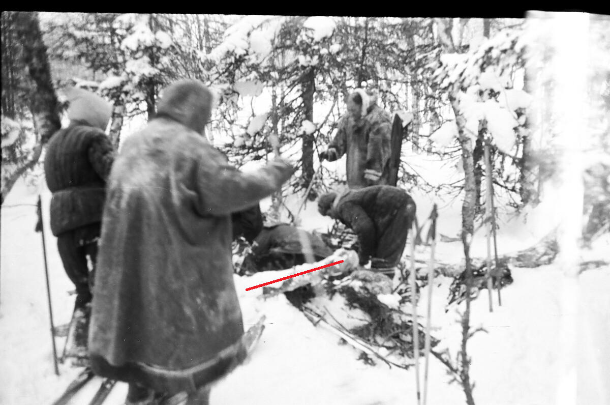 "Лабаз расположен на месте ночевки группы, хорошо закрыт приготовленными дровами, обложен картоном, еловыми лапами. У лабаза воткнуты в снег лыжи, одна пара, на носке лыжины повешен рваный гетр".