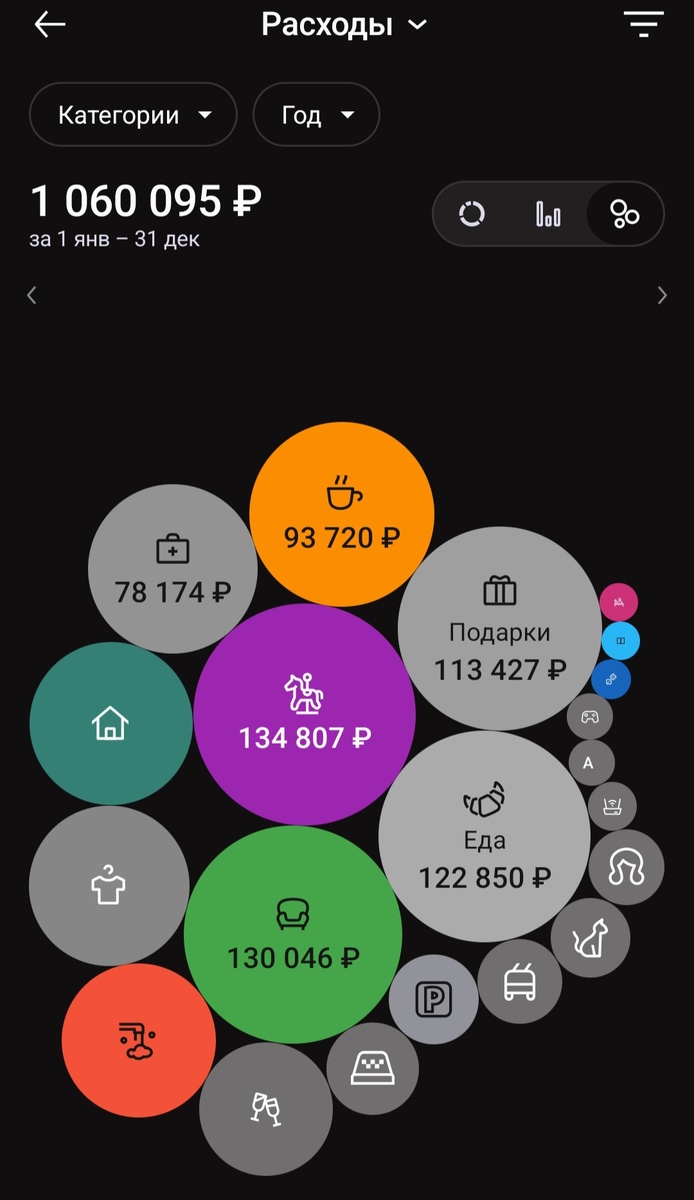 Общий итог: 1 060 095 ₽ ушло на жизнь. В среднем — 88 341 ₽ в месяц.