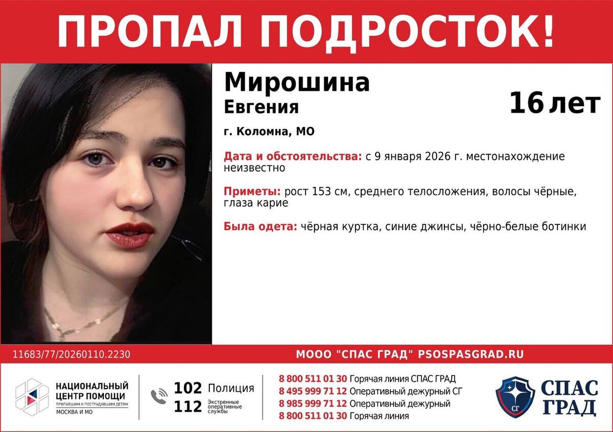 🔴 #Мирошина Евгения, 16 лет Дата и место пропажи: 9 января 2026 г., г. Коломна, МО Приметы: рост 153 см, среднего телосложения, волосы чëрные, глаза карие Была одета: чëрная куртка, синие джинсы, чëрно-белые ботинки Контактное лицо: Наталья 89251256728 Оперативный дежурный: 84959997112