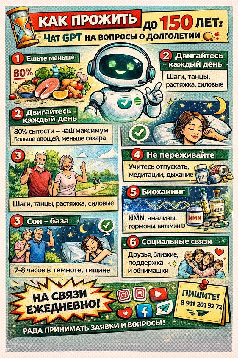 : 1. Ешьте меньше. 80% сытости — наш максимум. Больше овощей, меньше сахара. Долгожители не голодают, но и не переедают. 2. Двигайся каждый день. Не не только спортзал, но стиль жизни - шаги, танцы, растяжка, силовые. Мышцы = молодость. 3. Сон - база. 7-8 часов в темноте, тишине и без телефона под подушкой. Сон = антивозраст. 4. Не переживайте. Хронический стресс старит. Учитесь отпускать - это важный навык. Медитации, дыхание, майндфулнес — учимся с ними работать. 5. Биохакинг - не мода, а стратегия. NMN, ресвератрол, витамин D, анализы, гормоны — прокачивайте тело изнутри. 6. Социальные связи = долголетие. Любовь, друзья, близкие, обнимашки. Поддерживающие люди продлевают жизнь больше, чем суперфуды. 7. Минимум токсинов. Не только алкоголь и курение. А еще токсичные люди, драмы, негатив. Все, что ворует энергию, старит. 8. Уберите социальный шум. Это главное. Скроллинг, рилсы до 3 ночи, десятки Телеграм-каналов, просмотр всего подряд на ютубе. Выберите только тот контент, кот