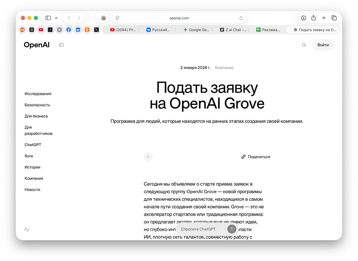 Цитирую: "Эта программа является отправной точкой для построения сети в долгосрочной перспективе. На старте программы вас ожидают пять недель контента и мероприятий, проводимых в штаб-квартире OpenAI в Сан-Франциско, в том числе очные мастер-классы, консультации каждую неделю и наставничество от технических лидеров OpenAI. Помимо технической поддержки и взаимодействия с сообществом, участники также получат возможность поработать с новыми инструментами и моделями OpenAI до того, как они станут общедоступными. По окончании программы участники смогут изучить возможности привлечения капитала или искать другие пути, как внутри OpenAI, так и за ее пределами." Мы мимо. Русский ИТ бизнес