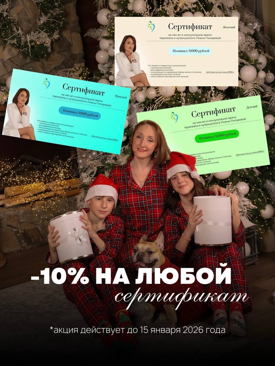✅ Сертификат на мою консультацию дает вам и вашим детям возможность получить: 👉назначение анализов 👉расшифровку анализов 👉консультацию по здоровому образу жизни и питанию 👉индивидуальный план питания 👉схему приема препаратов на 6 месяцев + связь со мной в течение 2 недель после консультации Это полноценный прием врача, но с понятной схемой приема препаратов на полгода и индивидуальной схемой питания🥗 Пишите мне в личные сообщения @Liana_pisareva_doc проконсультирую дополнительно📩