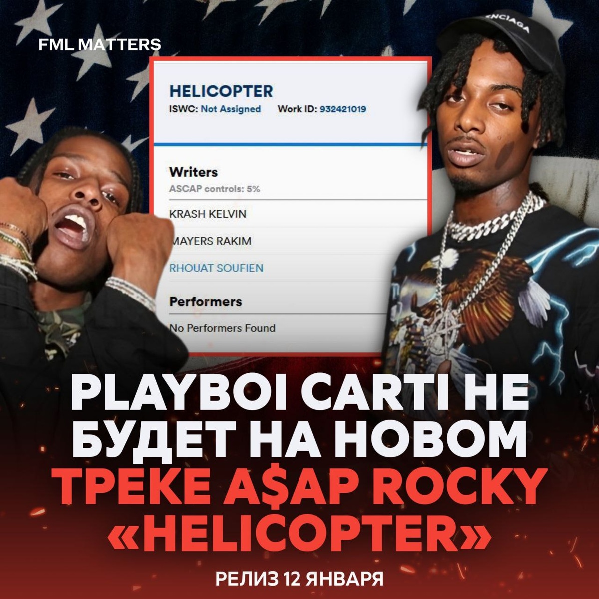 ❌ A$AP ROCKY ДРОПНЕТ «HELICOPTER» БЕЗ PLAYBOI CARTI! Ранее рэпер официально анонсировал, что его новый трек и клип «HELICOPTER» выйдут в понедельник. Однако, вопреки ранним слухам и слитой в сеть версии, в финальном релизе не будет участия Playboi Carti. Версию с Карти можно послушать в FML MUSIC 💀 FML MATTERS
