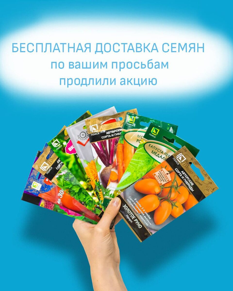 Маленький сюрприз для старта сезона 🌱 Мы начали отправлять ваши заказы с семенами — и решили порадовать вас приятным бонусом. Только 2 дня с 10 по 12 января действует бесплатная доставка при заказе семян на сумму от 1000 ₽. Самое время проверить свои запасы: все ли готово к сезону? Хватает ли любимых сортов, не забыли ли новинки, которые хотели попробовать в этом году? Чтобы было проще найти недостающие сорта и культуры, посмотрите, какие овощи вы можете найти в специальных сериях: 🌱в АВТОРСКИХ СОРТАХ И ГИБРИДАХ собраны овощи, созданные Агрофирмой ПОИСК. Они вкусны, полезны и хороши в переработке (при солении, мариновании и т.д.) хорошо хранятся и обладают высокой сортовой пластичностью, что позволяет выращивать их в различных почвенно-климатических условиях. 🌱во ВКУСНОТЕКЕ найдете отборные томаты! Сочные и ароматные, маленькие и большие, красные, оранжевые, желтые — но все без исключения с насыщенным вкусом! 🌱в ДОМАШНЕЙ ЗАГОТОВКЕ — лучшие сорта и гибриды овощных культур, которые и