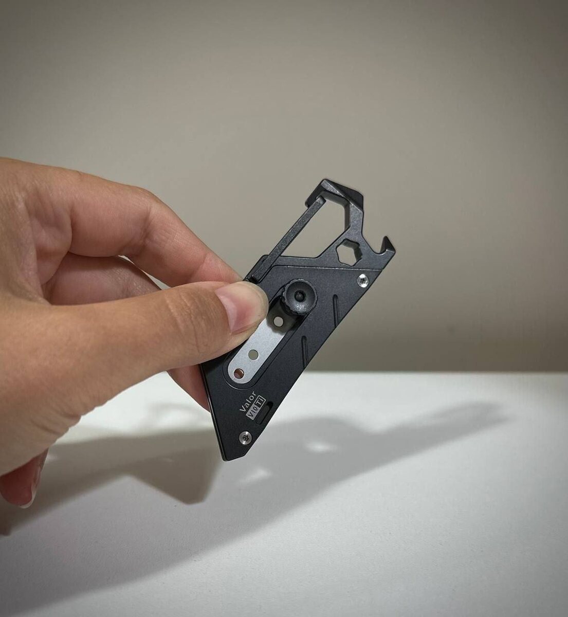 RovyVon V10-изготовлен из титана, даже винты в нём титановые. Это многофункциональный универсальный нож, которым можно открывать пиво или почтовые ящики. Если у вас нет под рукой шестигранного ключа, V10 справится с его задачей, то же самое касается и отвёрток. Встроенный карабин облегчает переноску.