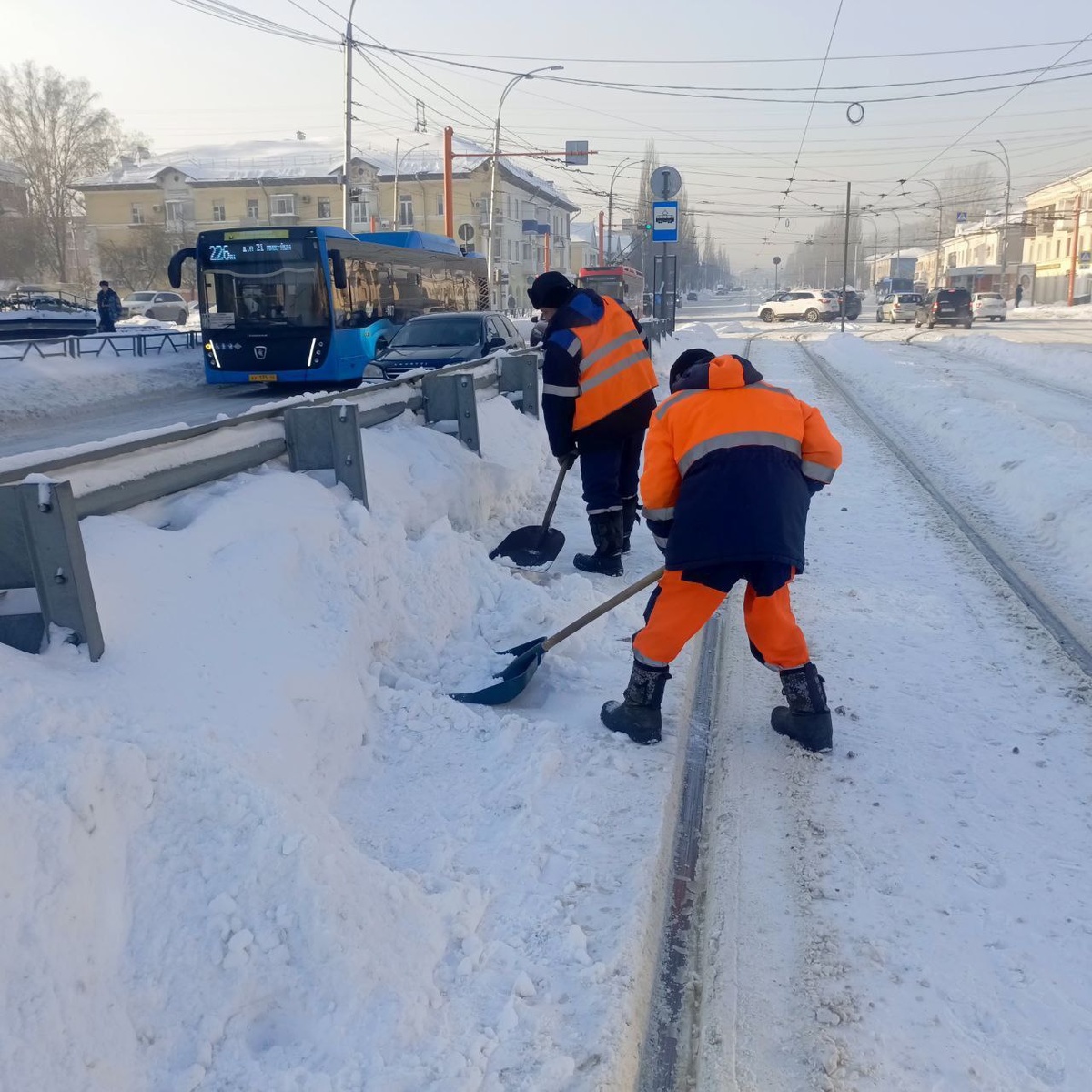 В Кемерове бригады путейцев помогают дополнительно к основной уборке расчищать от снега трамвайные остановки