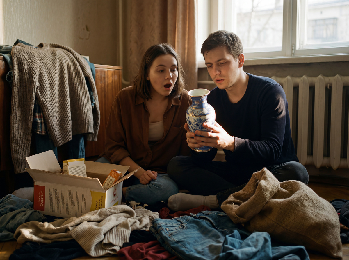 Старые свитера — растянутые, с катышками, пахнущие нафталином. Джинсы с дырками. Детские вещи — хотя у нас нет детей. Тарелки — сколотые, с трещинами. Кастрюля без ручки. Пакет с крупой — открытый, просыпавшийся наполовину.
