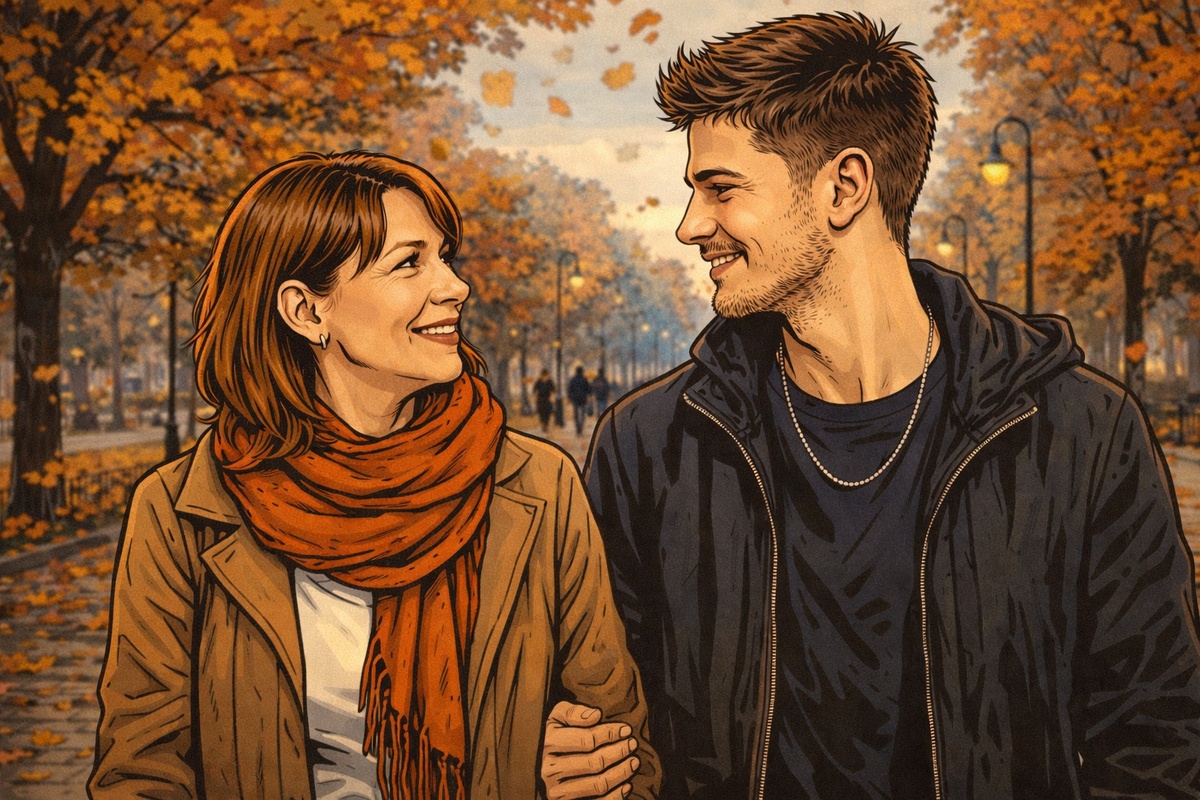 Все главы Когда они вышли из кафе, воздух был холодным, но не пронизывающе. Елена закуталась в шарф плотнее, а Максим не сразу заметил, что дрожь в её руках была не только от ветра. Он шёл рядом, слегка сбоку, будто хотел быть ближе, но не слишком. — Я не очень хорошо знаю этот район, — сказал он, чтобы заполнить паузу. — Обычно гуляю по знакомым улицам. — Я тоже. Но иногда хочется потеряться, — ответила она, поднимая взгляд на облака, пробегающие над крышами. — В таких прогулках есть что-то успокаивающее. Максим кивнул, но слова словно застряли в горле. Он хотел сказать больше — о том, как ему приятно быть рядом, как хочется держать её руку, но стеснение делало каждую фразу трудной. Вместо этого он просто замедлил шаг и чуть наклонился, чтобы казалось, что он случайно дотрагивается до её плеча. Елена почувствовала прикосновение, лёгкое и осторожное, но внутри всё напряглось. — У вас красивые глаза, — произнёс он, не глядя прямо, но слышно было, как в голосе дрожит. Она улыбнулась, и у