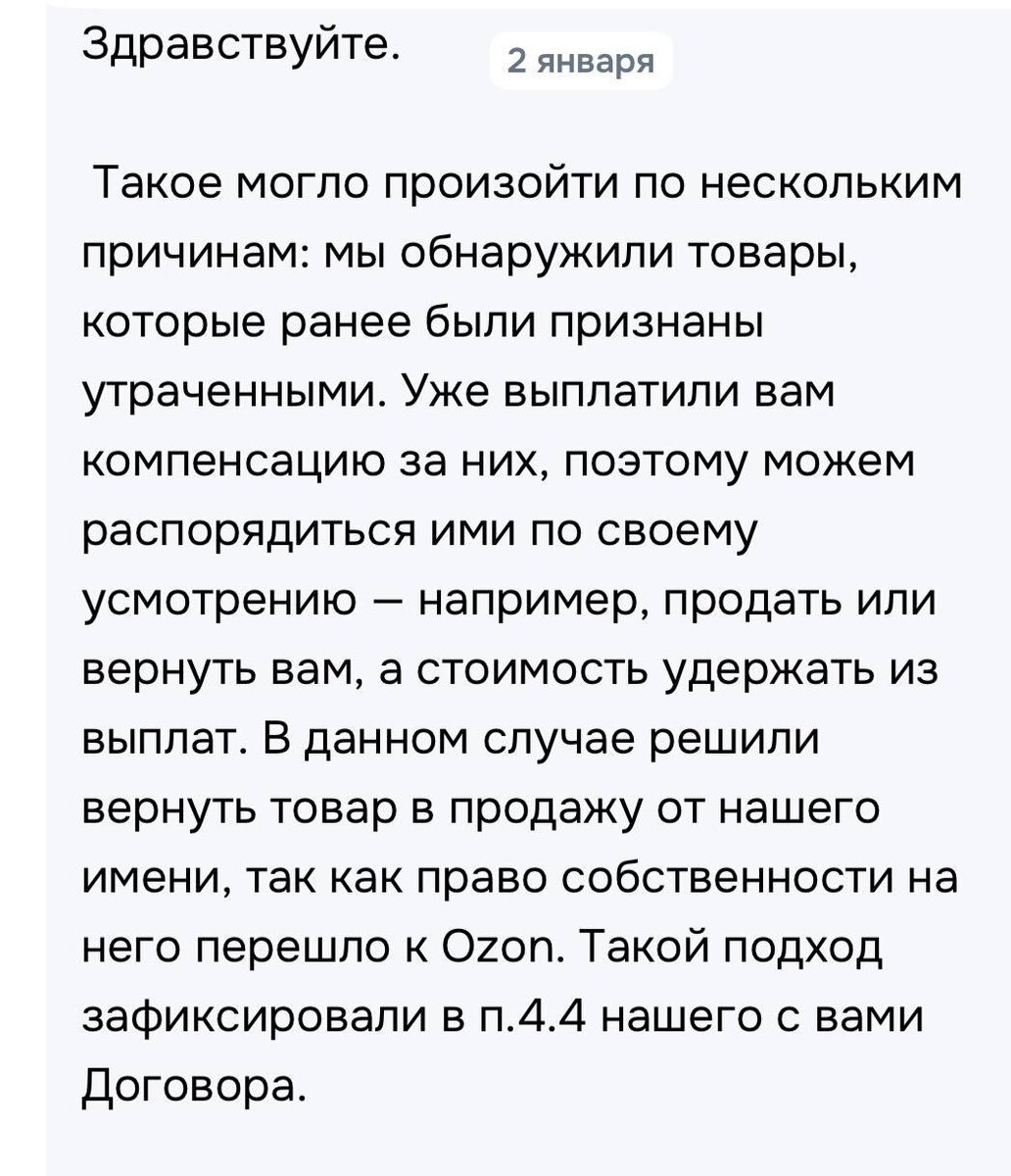 Когда Ozon внезапно нашёл потерянный товар и он стал уже не Вашим Продолжение истории с потерянными поставками на Ozon — и тут уже уровень абсурда выше. Селлер сдал поставку на склад, одну коробку «потеряли». В компенсации отказали — нет видео погрузки в авто. Спустя примерно месяц коробка внезапно находится… и товар начинает продаваться от лица Ozon с того же склада, где он пропал. Логика поддержки простая и железная: видео не предоставили — компенсации не будет. А раз компенсации не было, но товар нашёлся, значит он теперь собственность маркетплейса. Дальше — прямая цитата селлера У нас подобная история, но с продолжением, так же сдали на склад поставку, потерянную коробку озон не компенсировал так как мы не предоставили видео погрузки в авто, а самое интересное что примерно через месяц эта коробка видимо нашлась и наш товар начал продаваться от лица озон 😂 причем именно с того склада куда её сдавали и где она потерялась При обращении в поддержку ответ простой - вы не предоста