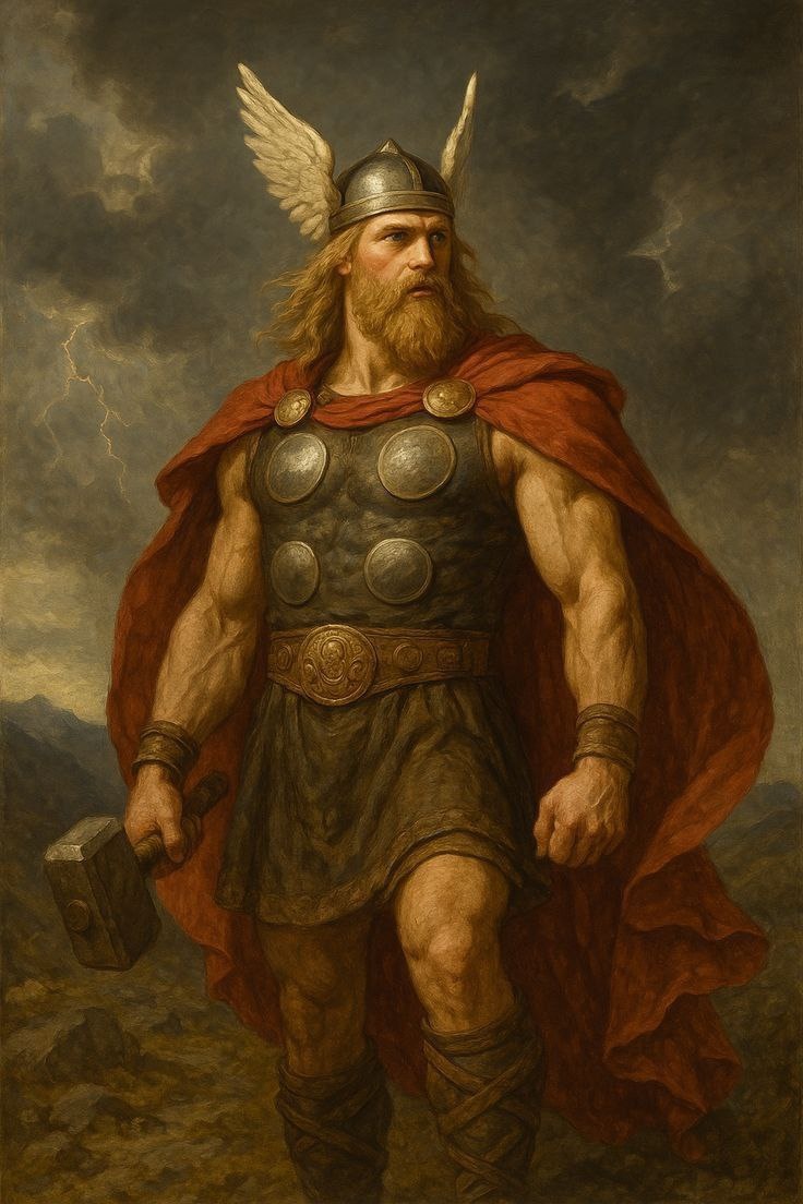 ? ⚡️ В скандинавских мифах Тор — это не голливудский красавец, а могучий рыжебородый великан, защитник мира людей (Мидгарда). Он прямолинеен, вспыльчив, но честен. Если другие боги плетут интриги, Тор просто берет свой молот и идет решать проблему силой. Для викингов он был главным богом-покровителем.