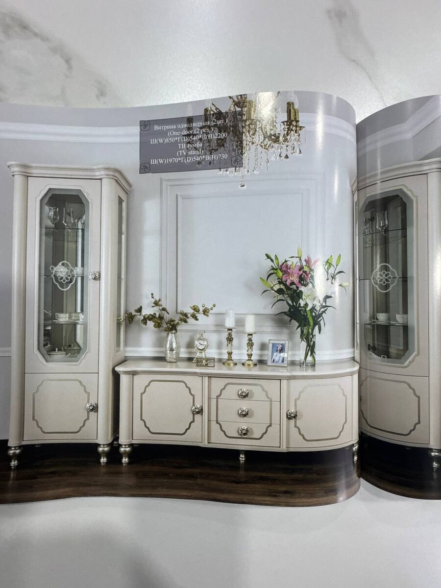 Шкафы имеют стеклянные дверцы, что позволяет видеть их внутреннее содержимое. Комод украшен декоративными элементами и ручками, что придает ему элегантный вид.