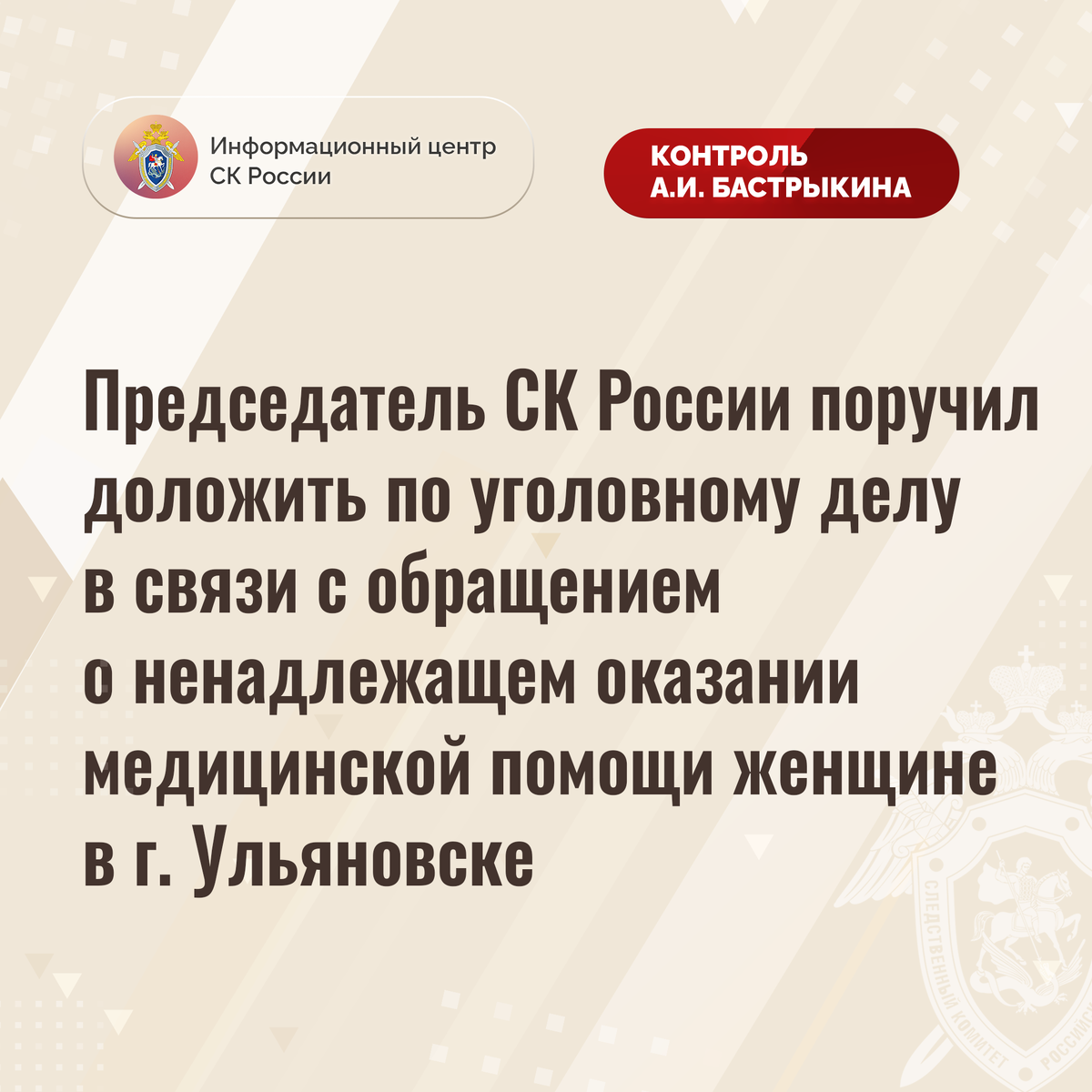 Председатель СК России поручил доложить по уголовному делу в связи с обращением о ненадлежащем оказании медицинской помощи женщине в г. Ульяновске В комментариях в аккаунте приёмной Председателя СК России А.И. Бастрыкина в социальной сети «ВКонтакте» обратился житель Ульяновской области, выразив несогласие с ходом установления обстоятельств ненадлежащего оказания медицинской помощи его супруге в перинатальном центре города Ульяновска. В ноябре 2021 года женщине проведена плановая операция, после которой состояние пациентки ухудшилось, впоследствии ей установлена инвалидность. Позднее супруга заявителя скончалась. Отмечается затяжной характер расследования уголовного дела. Указанная ситуация освещалась в сети Интернет. В СУ СК России по Ульяновской области с марта 2023 года расследуется уголовное дело, по которому ранее А.И. Бастрыкин поручал представить доклад. Председатель Следственного комитета Российской Федерации Александр Иванович Бастрыкин поручил руководителю СУ СК России по Ул