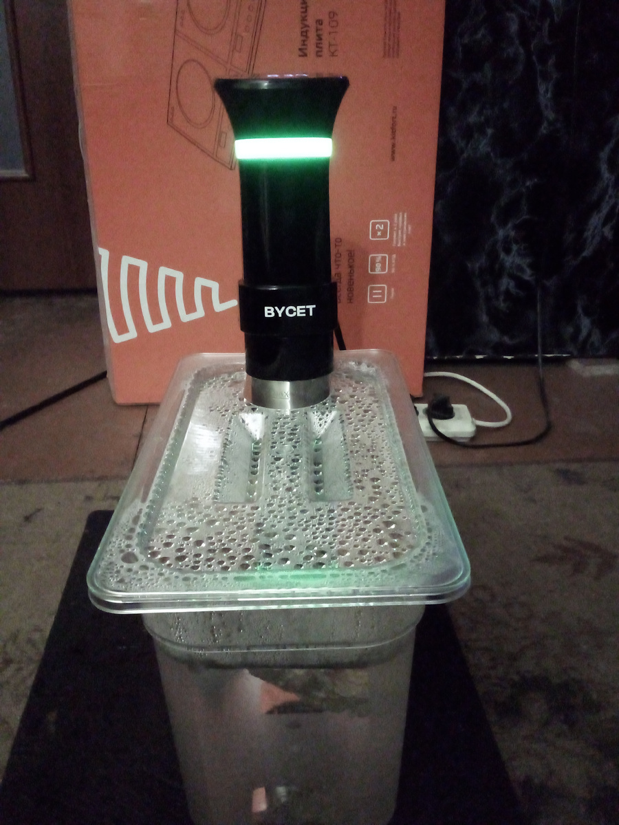 ❶ 38 °C (низкотемпературная ферментация) · 🥛 Йогурт — 240 мин · 🍓 Клубника в шоколаде — 5 мин ❷ 57 °C (мягкое прогревание) · ☕ Кофейный ликёр — 30 мин · 🍋 Лимончелло — 120 мин · 🐟 Путассу — 60 мин ❸ 60–65 °C (деликатная тепловая обработка) · 🍅 Томаты — 45–60 мин · 🥚 Яйцо пашот — 50 мин · 🍗 Курица в сливочно-грибном соусе — 65 мин · 🍗 Курица/индейка (грудка/бедро) — 60–180 мин · 🫑 Перцы фаршированные — 300 мин · 🍏 Яблоки с мёдом — 300 мин · 🥚 Яйца — 60 мин ❹ 72 °C (умеренный нагрев) · 🧈 Паштет из куриной печени — 60 мин · 🫑 Перцы ленивые — 90 мин ❺ 78–80 °C (средняя температура) · 🧀 Сыр рикотта (заготовка) — 40 мин · 🧈 Ароматное масло — 120 мин · 🍌 Бананы в шоколадном соусе — 90 мин · 🍖 Колбаса ливерная — 40 мин · 🍮 Крем-брюле — 60–65 мин · 🦖 Ножки свиные — 480 мин · 🧁 Творожная запеканка — 90 мин · 🍰 Чизкейк — 90 мин ❻ 83–85 °C (повышенный нагрев) · 🍈 Заготовка из тыквы — 90 мин · 🐷 Свиная шкура — 300 мин · 🦴 Свиные рёбра — 360 мин · 🧈 Топлёное масло — 60 мин ·