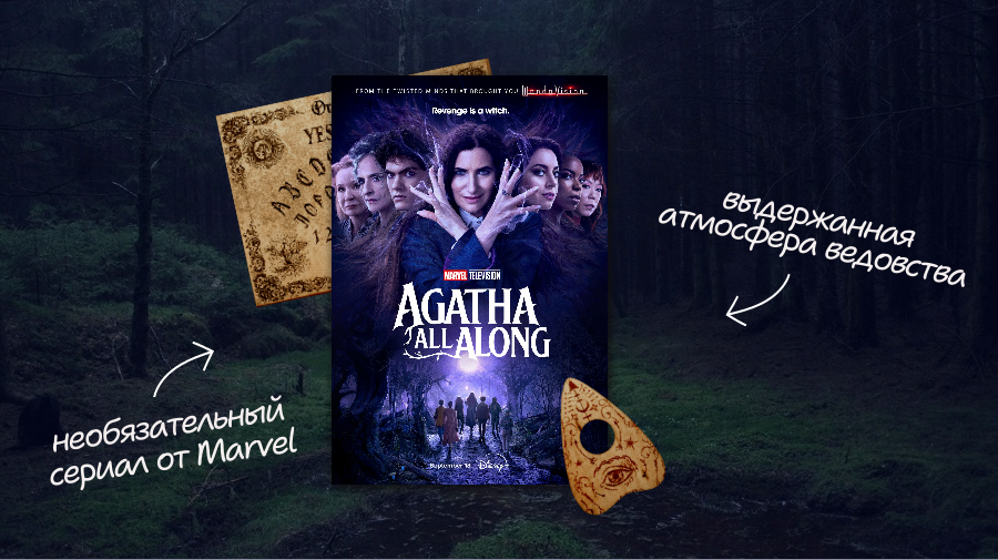 Много лет назад, когда трава была зеленее, а Marvel снимал интересные сериалы, я посмотрела «Ванда/Вижн» и пришла в неимоверный восторг. Тогда казалось, что студия ещё на коне - однако следующие проекты становились всё более необязательными к просмотру. Таким была и «Это всё Агата», которую в момент выходя я пропустила. Но почему-то продолжала возвращаться к ней. Пожалуй, дело здесь в двух вещах: Второго «Ванда/Вижна», конечно же, не случилось, но удовольствие в итоге я получила: от простоватого, но приятного сюжета, от замечательной музыки, от восхитительно оформленных титров и да, от духа истории. Сериал «Это всё Агата» посвящён ведьме Агате Харкнесс, могущественной и лишённой моральных ориентиров. Она едва не погубила Ванду Максимофф, но та смогла одолеть её и заключить в иллюзию - в первой серии Агата искренне верит в то, что работает детективом в маленьком американском городке. Однако образ окружающего её мира трещит по швам, когда в него врывается наделённый магическим талантом м