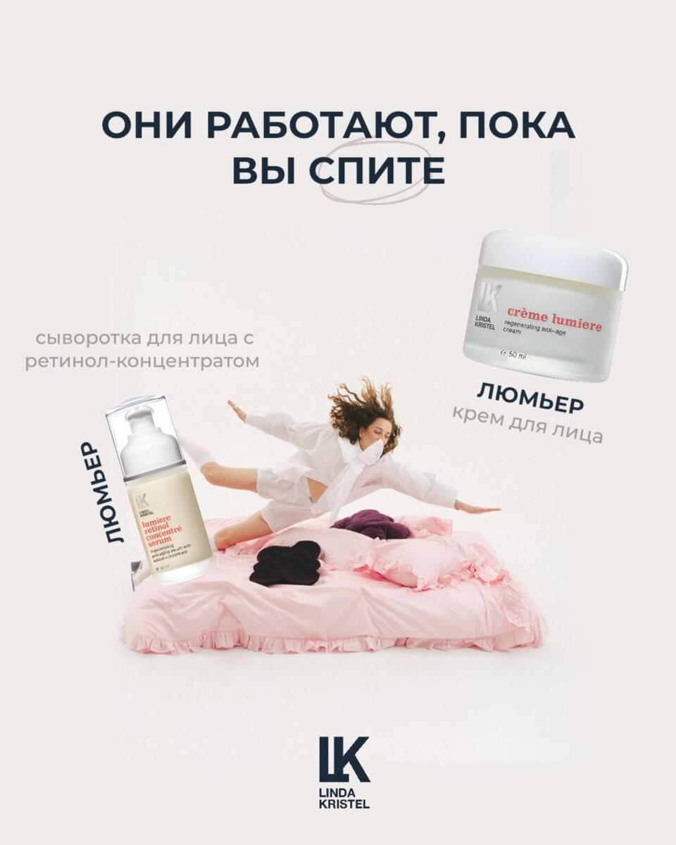 🛌 Ночной уход — это время, когда кожа максимально восприимчива к активным формулам. Именно поэтому вечерние ритуалы так заметны утром — кожа выглядит более ровной, свежей и сияющей. // Вот что можно смело оставлять на ночь из Linda Kristel: ✨Сыворотка «Люмьер» с ретинол-концентратом Восстанавливает и обновляет кожу, разглаживает морщины, мягко выравнивает рельеф, помогает справляться с шелушением и делает тон более ровным. Наносите на очищенную кожу лица и шеи 5–6 капель — самостоятельно или добавляйте 1–2 капли в крем. ✨ Крем для лица «Люмьер» Питает и смягчает, повышает плотность и упругость, выравнивает тон, уменьшает выраженность морщин и поддерживает кожу в период холода и городских факторов.
