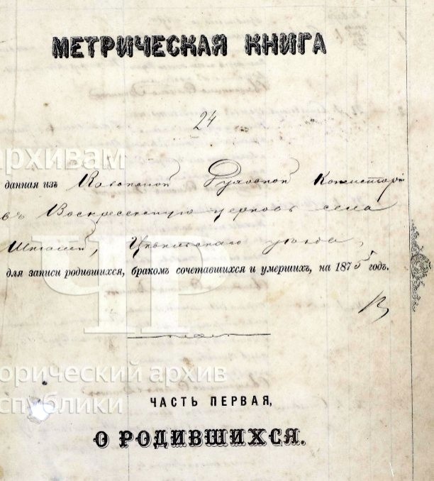 Село Шигали Воскресенские. Метрическая книга о родившихся за 1863-1880 гг. 1 января 1863 — 31 декабря 1880 ГИА Чувашской Республики (ГИА ЧР), фонд № 557, опись № 7, дело № 279, стр. 585 скан. Метрическая книга, данная из Казанской Духовной Консистории в Воскресенскую церковь села Шигалей Цивильского уезда для записи родившихся, браком сочетавшихся и умерших на 1875 год. Часть первая. О родившихся. Стр. 605 скан. Май. № 84. 1 числа родился. 11 числа крещен. Сидор. Родители: деревни Яшкильдиной Шоркасов казенный из чуваш крестьянин Алексей Никитин и законная его жена Матрона Семенова, оба православного исповедания. Восприемники: деревни Ближней Сормы таковый же Сергей Феодоров. Таинство крещения совершил: Священник Симион Воинов. Пономарь Евлампий Альфонсов. https://yandex.ru/archive/catalog/20880962-3946-4655-a564-9eb4d667a0d4/605