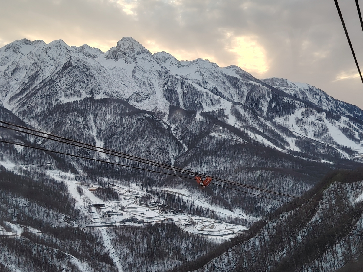С каждой минутой пейзаж за стеклом меняется. Внизу остаются дома, дорожки, станции, а выше появляются густые леса, склоны, покрытые мягкими линиями трасс, и бесконечные горные хребты. Всё это словно движется неспешно, плавно, будто сама природа даёт время рассмотреть себя со всех сторон.