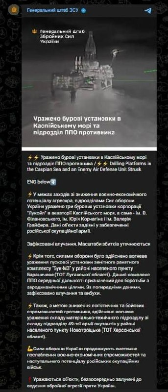 Генштаб ВСУ заявляет о поражении трех буровых установок "Лукойл" в Каспийском море.