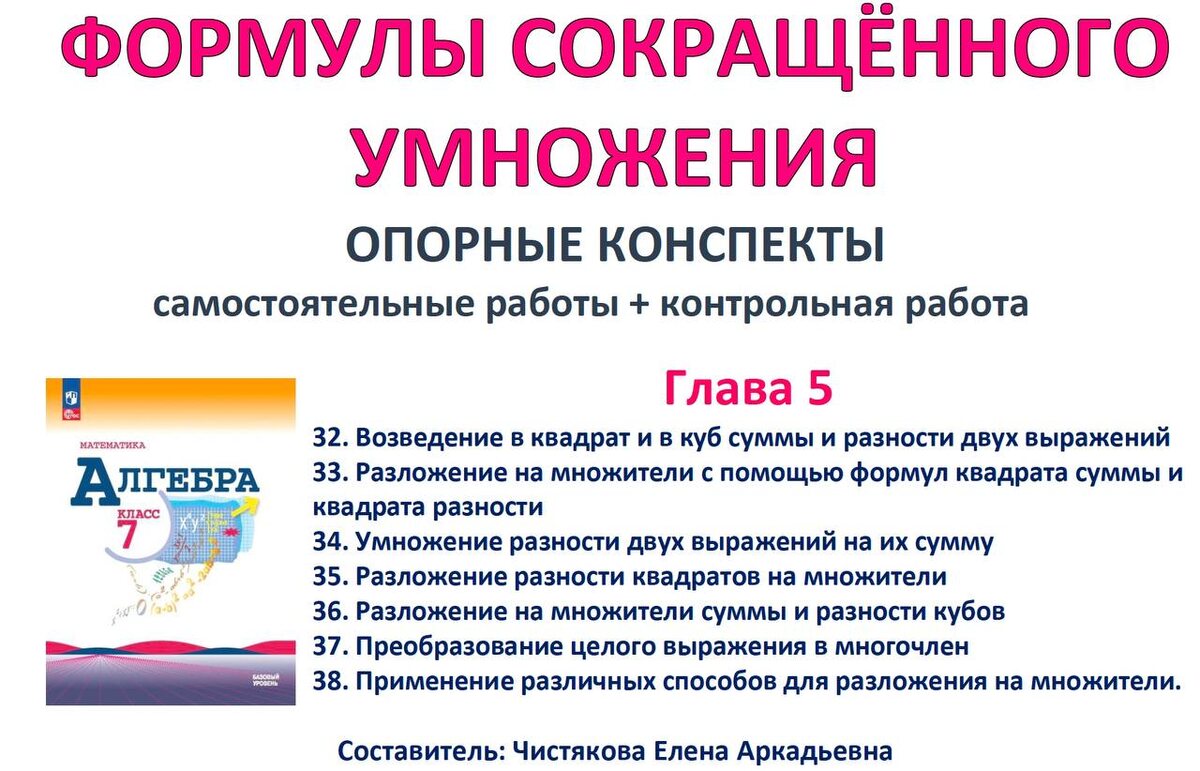 🆗7 класс Опорные конспекты + Самостоятельные работы + Контрольная работа "Формулы сокращённого умножения" 📥Скачать: extramath.ru/p/18678 Содержит: 🔹 7 опорных конспектов к п.33-38 учебника "Алгебра 7" Макарычев 2023; 🔹 9 самостоятельных работ с ответами; 🔹 контрольную работу по теме в 6 вариантах с полным решением и критериями оценивания. Материал скомпонован в три PDF файла: 🔹Файл учителю 19 страниц. 🔹Файл ответы 41 страница. 🔹Файл репетитору 33 страницы.