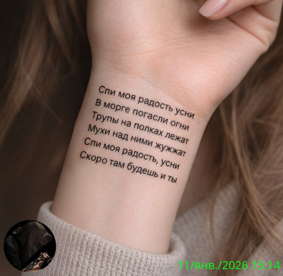 Татуировки давно перестали быть просто украшением тела. Они стали способом самовыражения, способом рассказать миру о своих мыслях, чувствах и переживаниях. На представленном фото изображена татуировка с текстом, который, на первый взгляд, может показаться мрачным и даже шокирующим. Однако за этим текстом скрывается глубокий смысл, который может быть понятен только самому владельцу татуировки.