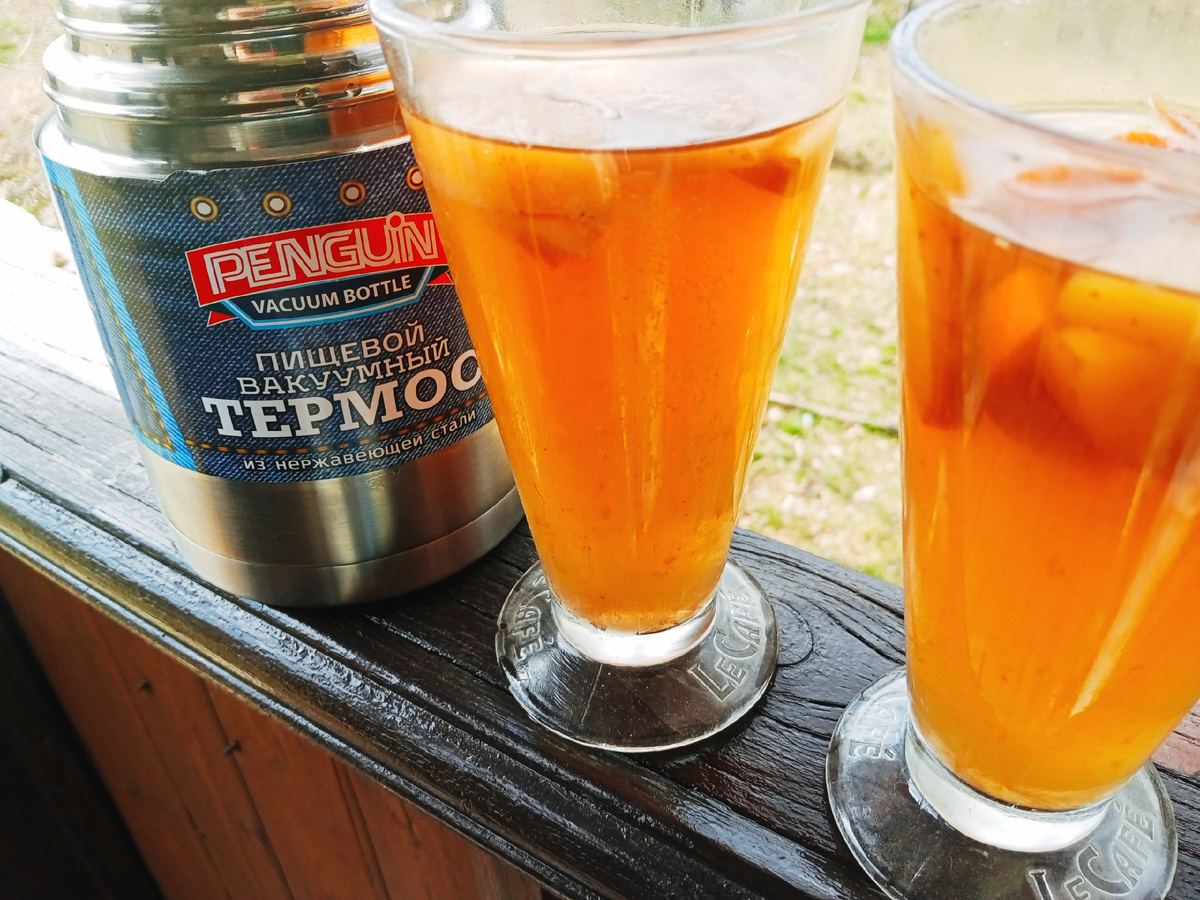 Глинтвейн - идеальный напиток для зимних прогулок - налейте его в термос и согревайтесь где угодно! Можно пойти дальше - и не просто налить в термос глинтвейн, а непосредственно в термосе его и приготовить! Яблочный сок - 900 мл Апельсин - 1 шт. Яблоко - 1 шт. Пряности (опционально: корица, бадьян, гвоздика, имбирь) Мёд - по вкусу Термос - 07-1л Приготовление Налейте в ковш яблочный сок - для ускорения процесса отлично подойдёт пакетированный, берите ваш любимый. Нарежьте дольками апельсин и яблоко, добавьте к соку вместе с пряностями. Сок нагрейте почти до кипения (до пузырьков), но не кипятите. Вылейте в предварительно прогретый термос, добавьте 🍯 из расчета 1 ч.л. на стакан напитка/по вкусу (не забываем, что в соке уже есть сахар❗). Плотно закрутите термос и дайте глинтвейну настояться не менее часа. А вообще термос (при условии, что он качественный и надежный, такой как Penguin) сохранит глинтвейн горячим до 6-10 часов!