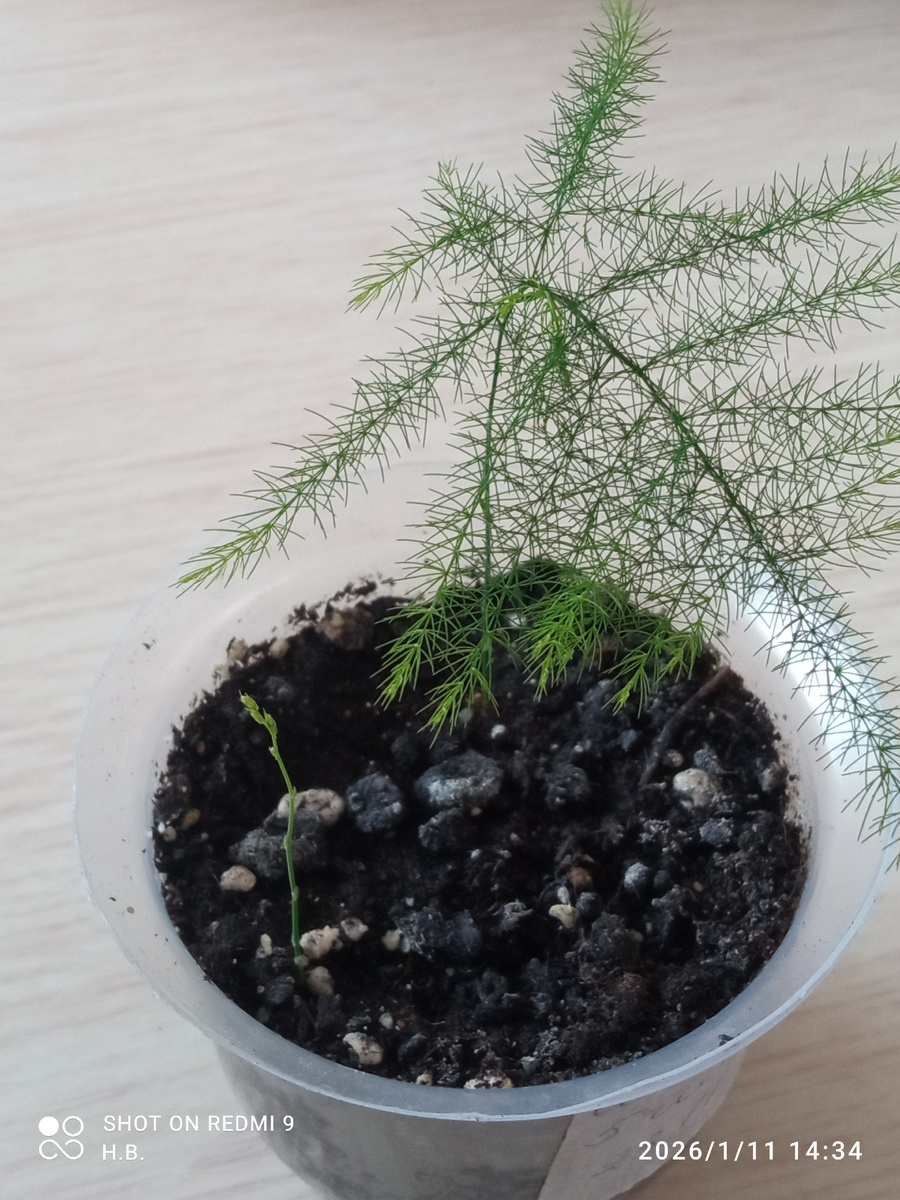 Начну с аспарагуса перистого. Посеяла три семени 23 ноября. Взошло два. У самого первого появилась уже вот такая пушистая веточка. Второй росточек появился буквально дня три назад. Хотите пушистое зеленое облачко? Заведите себе аспарагус перистый, тем более что вырастить его из семян не составит труда.