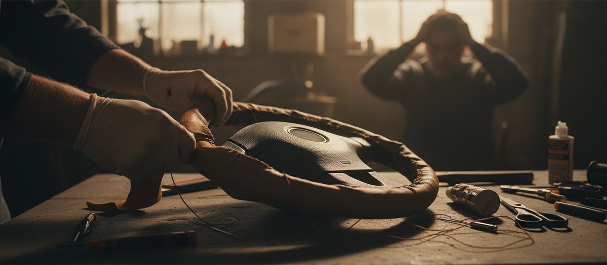 ошибки: кожа морщится, швы получаются кривыми, руль теряет форму, а