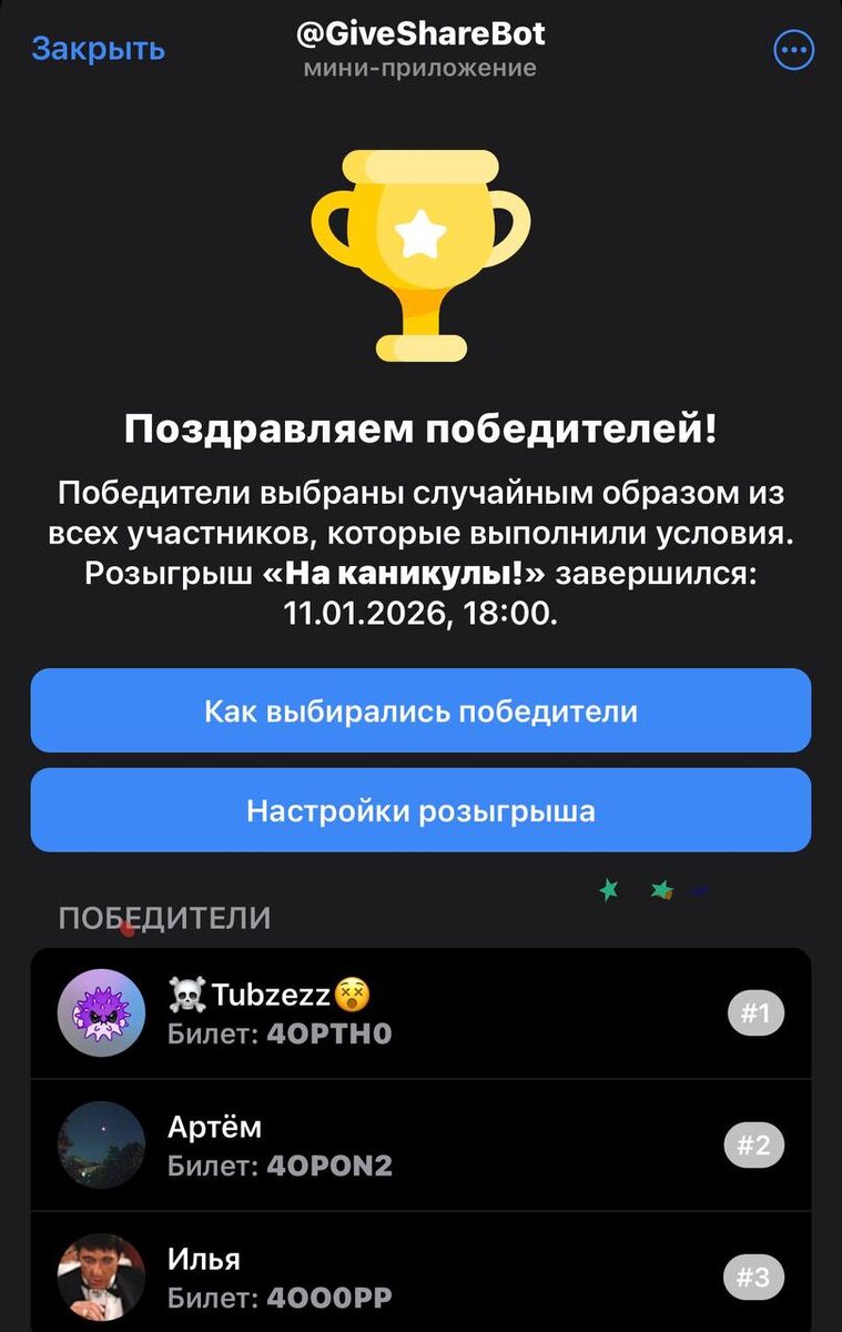 🥳 Розыгрыш завершился и у нас есть три победителя