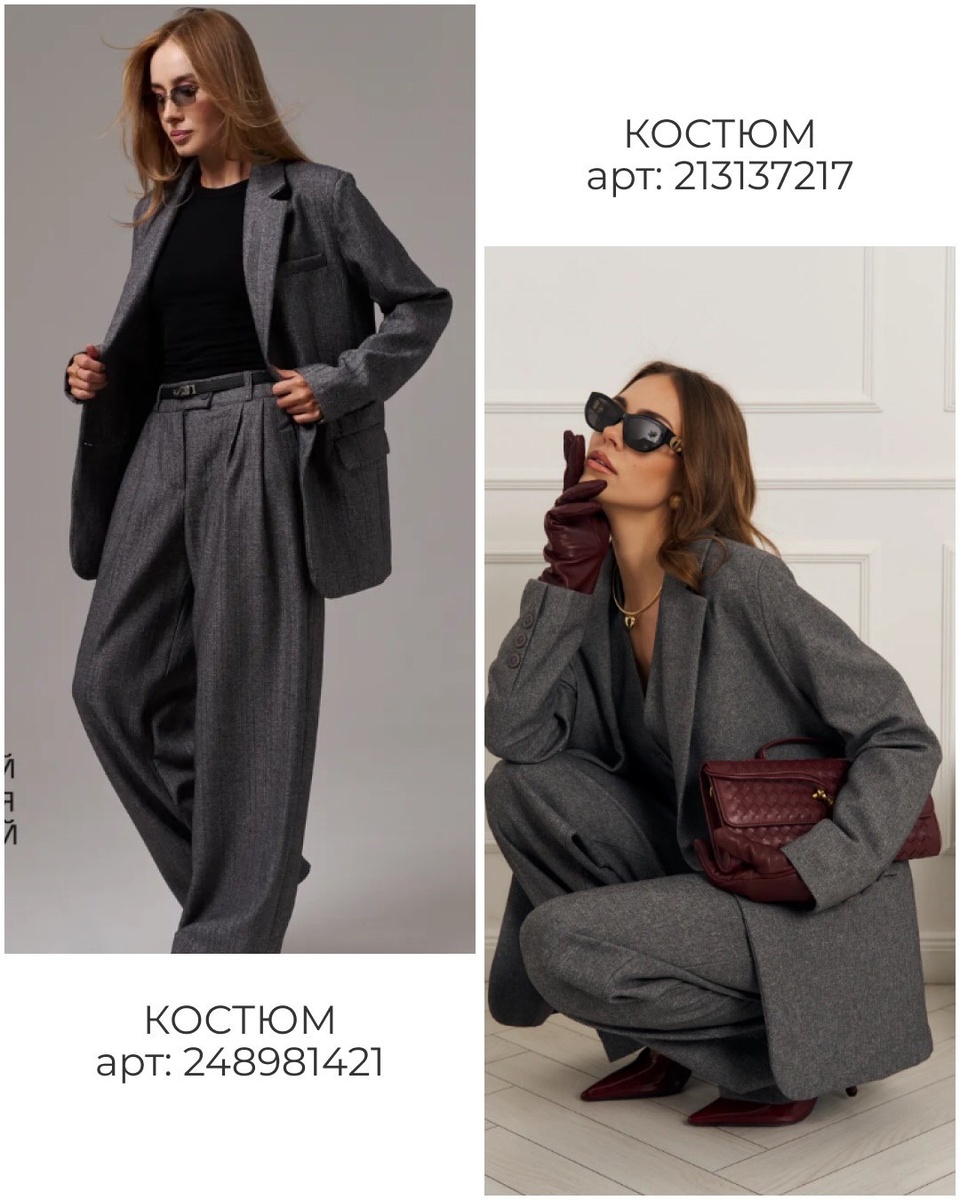 Есть вещи, которые мгновенно собирают внешность в цельный, уверенный силуэт — и костюм как раз из таких. Он дисциплинирует линию плеч, выстраивает пропорции, добавляет «статуса» даже в самый простой день и отлично работает как комплектом, так и по отдельности: жакет к джинсам, брюки к водолазке, юбка к рубашке. На фото — шесть выразительных вариантов, каждый со своим настроением: от холодной графики серого до сливочной строгости и шоколадной драматичности. Ниже — подробный разбор каждой находки по порядку артикулов, с подсказками стилиста и важными деталями, которые решают всё.