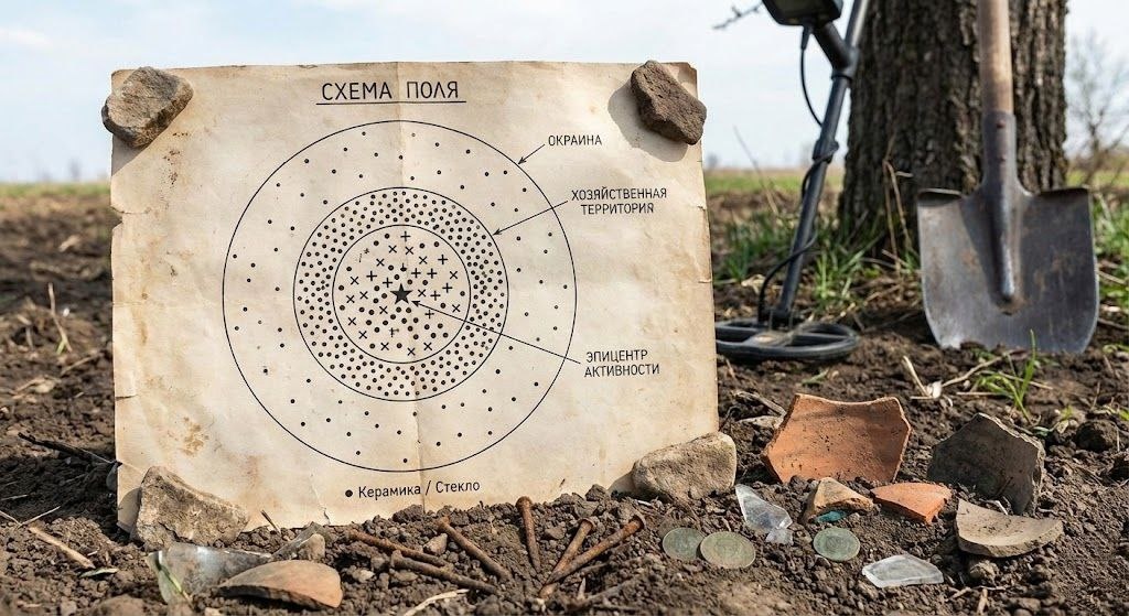 🧭 Вы нашли пару монет, а вокруг лежит множество черепков, гвоздей и стекла. Не стоит спешить уходить. Эта сопутка является точной картой, ведущей к цели. Читаем поле 🗺️ Частая ошибка заключается в том, чтобы идти только за сигналом металлоискателя, игнорируя общий фон. Историческая жизнь концентрировалась очагами. Распределение неметаллических артефактов, таких как керамика, оконное стекло или кость, хорошо показывает границы и эпицентр такой активности. Как это работает на практике 🔍 1. Обнаружив первые находки, перестаньте копать и переключитесь в режим разведки. 2. Методично, желательно по квадратам, пройдите участок, фиксируя все видимые на поверхности фрагменты. 3. Мысленно или в дневнике нанесите их на схему. Перед вами проявится картина. Вы увидите зону редких фрагментов, то есть окраину, зону плотного скопления, часто соответствующую хозяйственной территории, и, наконец, четкое пятно максимальной концентрации и разнообразия. 4. Центр этого пятна станет вашей приоритетн