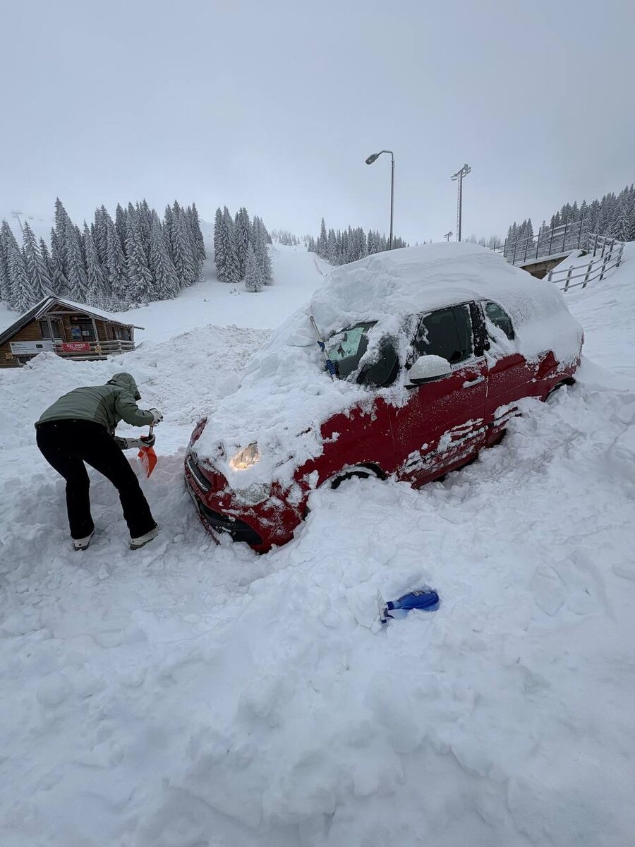 Поэтому спортивные подвиги пока откладываются - продолжаются гастрономические. На завтрак мы отправились в кафе, оформленное в стиле горного шале: везде передвигаемся пешком, чтобы с машиной лишний раз не заморачиваться - в итоге каждая вылазка превращается в энергозатратную прогулку. За соседним столиком завтракали лыжники из Германии: порцию сосисок они щедро полирнули пивом. Надеюсь, это не влияет на скорость реакции на склоне) Любая еда в меню - очень сытная: например, традиционный завтрак - это яйца, копченое мясо, сыр и хлеб. Вроде все, как и в Сербии, но вкуснее (мое субъективное мнение). Минус - чисто балканский: везде можно курить, так что одежда и волосы, кажется, прокурены насквозь. Но это уже как будто привычно.