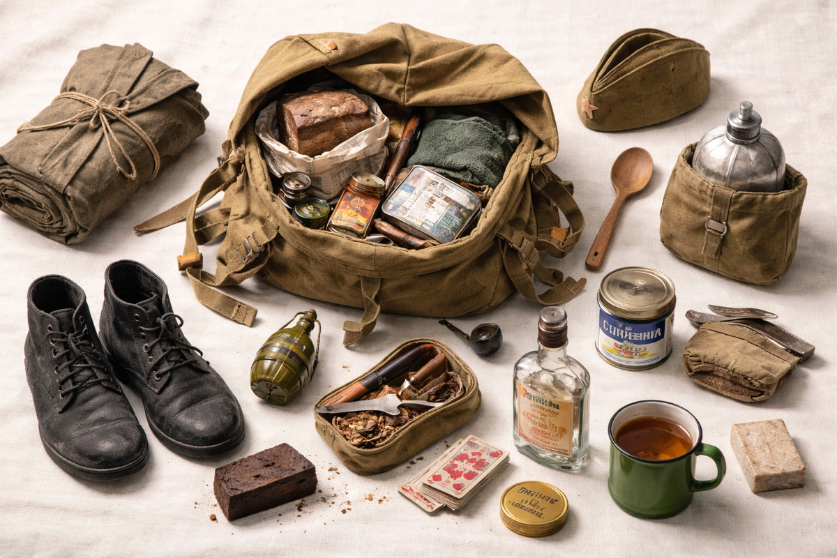 Немцы таскали личные вещи — мыло, рыльно-мыльные принадлежности, карты, письма — часто в карманах кителя или в сухарной сумке. У них всё было рассовано по углам. Наш солдат знал: если скинул вещмешок на привале — ты скинул весь свой быт. Взял его — и дом снова с тобой.