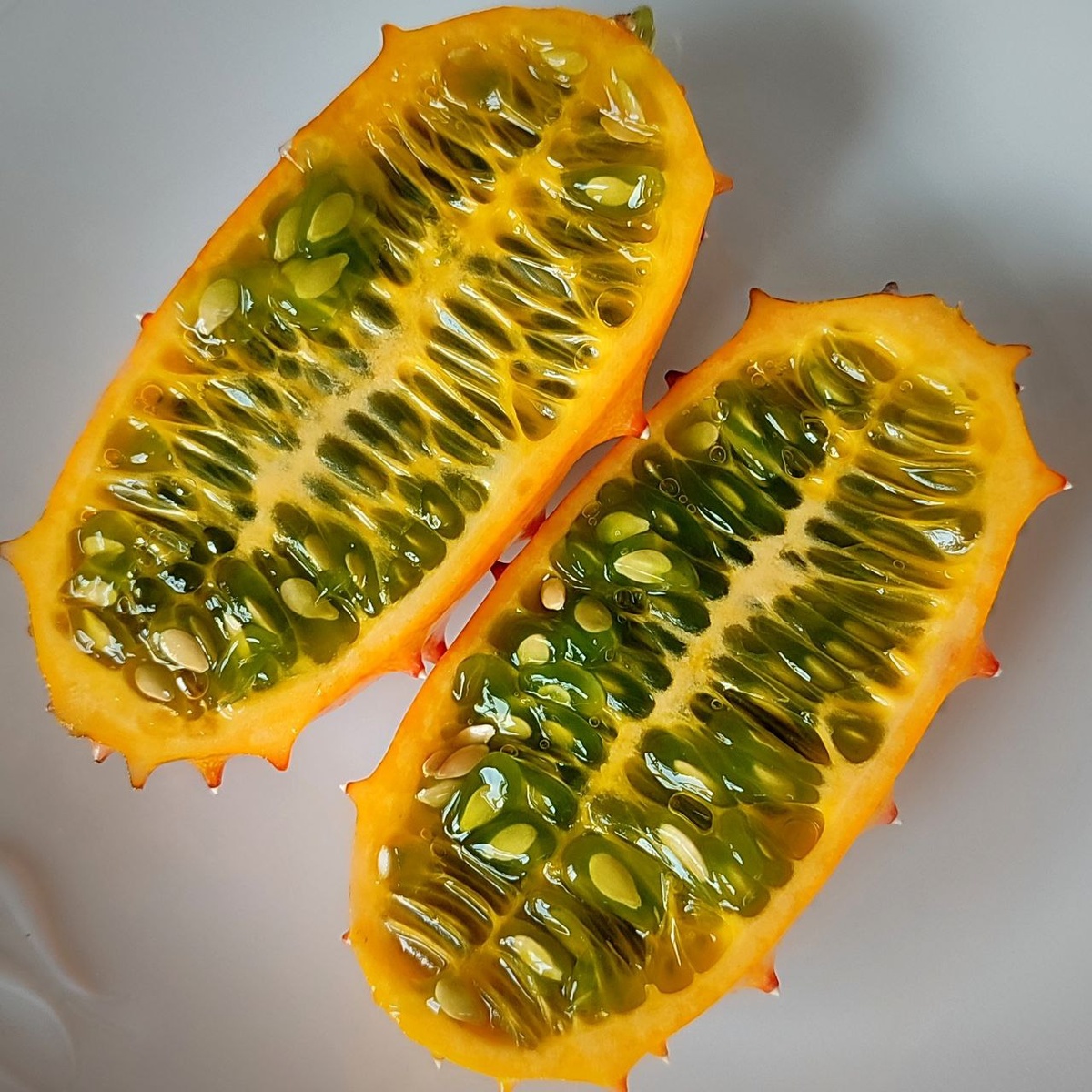 Вчера на фермерском рынке увидела незнакомый плод! Я, спросила, что это, но ответы продавца (на турецком ) ситуацию не прояснили. ⠀ Зато цена за этого кота в мешке показалась мне вполне адекватной - 50 руб. за штуку. ⠀ Конечно я купила! ⠀ Дома с помощью интернета выяснила, что плод имеет название Кивано/Рогатая дыня/Африканский огурец. Последнее название, по-моему, ему подходит больше. ⠀ Дегустацию проводила уже сегодня. Разрезала на 2 половинки и обнаружила только семечки в зеленой субстанции. ⠀ Интернет обещал вкус, похожий на огурец+банан. Ничего общего я с бананом не увидела. Я бы сказала, что огурец+лайм. Причем, огурец уже перезревший, потому что семена оказались довольно твердыми и некомфортными для жевания. ⠀ В общем, я уже хотела признать этот пищевой эксперимент полным провалом, но пришел муж и заявил, что он хочет попробовать его в смузи. Ладно. Я так и сделала. Для простоты взяла самые стандартные ингредиенты (апельсин, банан, грушу и геркулес) и перемолола с этим кивано.