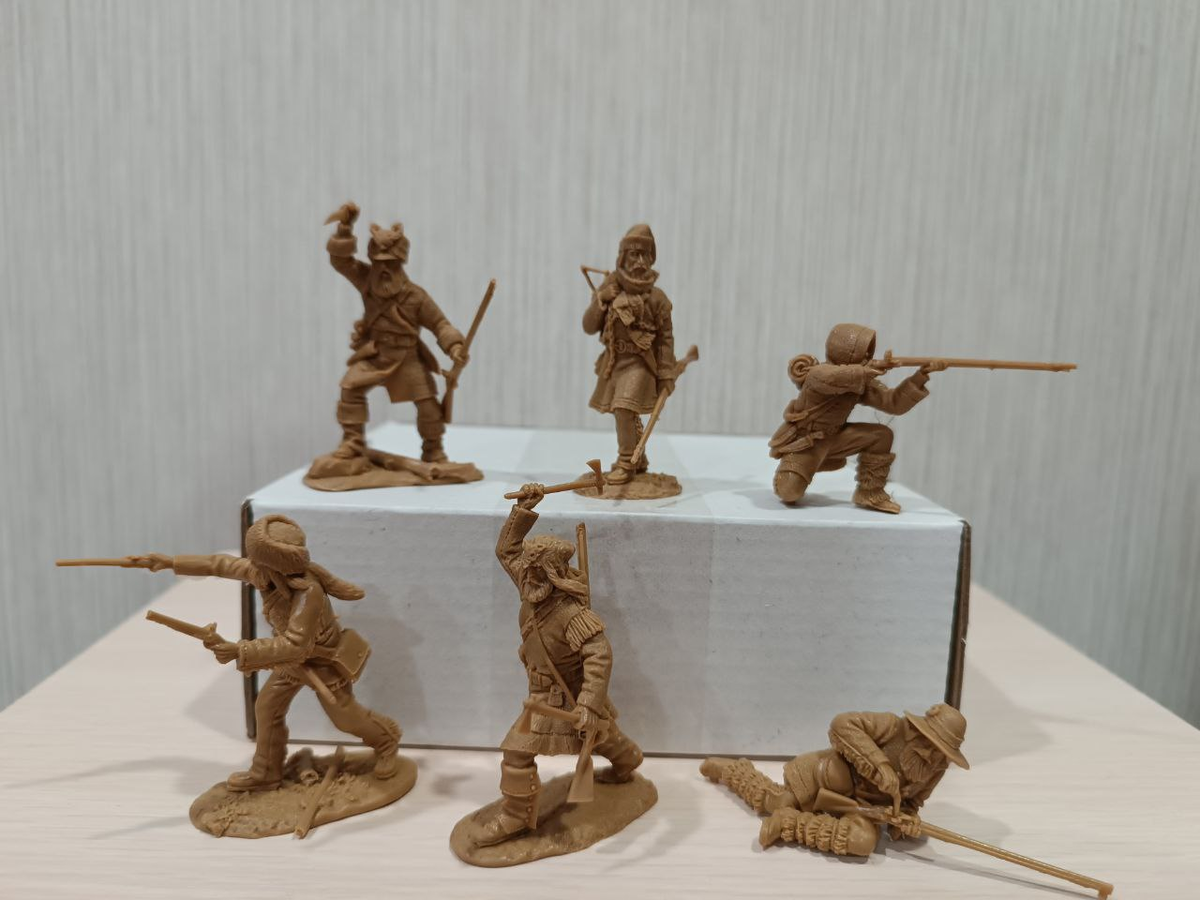 Ave любители солдатиков! До красивой цифры в "100" в заголовке данной рубрике осталось буквально три "шага" ;). Так что без лишних слов передаю виртуальную трибуну Сергею Тарасову, который пополнил свою коллекцию новым, замечательным набором. Фотографии - Сергей Тарасов Набор от Plastic Platoon. Масштаб 1/3ц. Трапперы. Набор состоит из 6 фигурок. Первая же фигурка отличается от всех остальных. Первое головной убор. Данный персонаж носит на голове вязанный колпак. Второе, это один из наиважнейших атрибутов трапперов. Капкан. Да, у этого траппера есть капкан. Редко встречал (если вообще встречал) данный атрибут в наборах у трапперов. Вторая фигурка в лежачей позе. Видимо траппер произвел только что выстрел и перезаряжает оружие. Третий представитель набора трапперов вступил с кем то в схватку и использует сразу два томагавка. На шапке видна скорее всего лисья мордочка. Для волчьей слишком мала. Хотя не обязательно лисья, может и мордочка песца. Четвертый траппер. Стрелок с колена. Мне оч