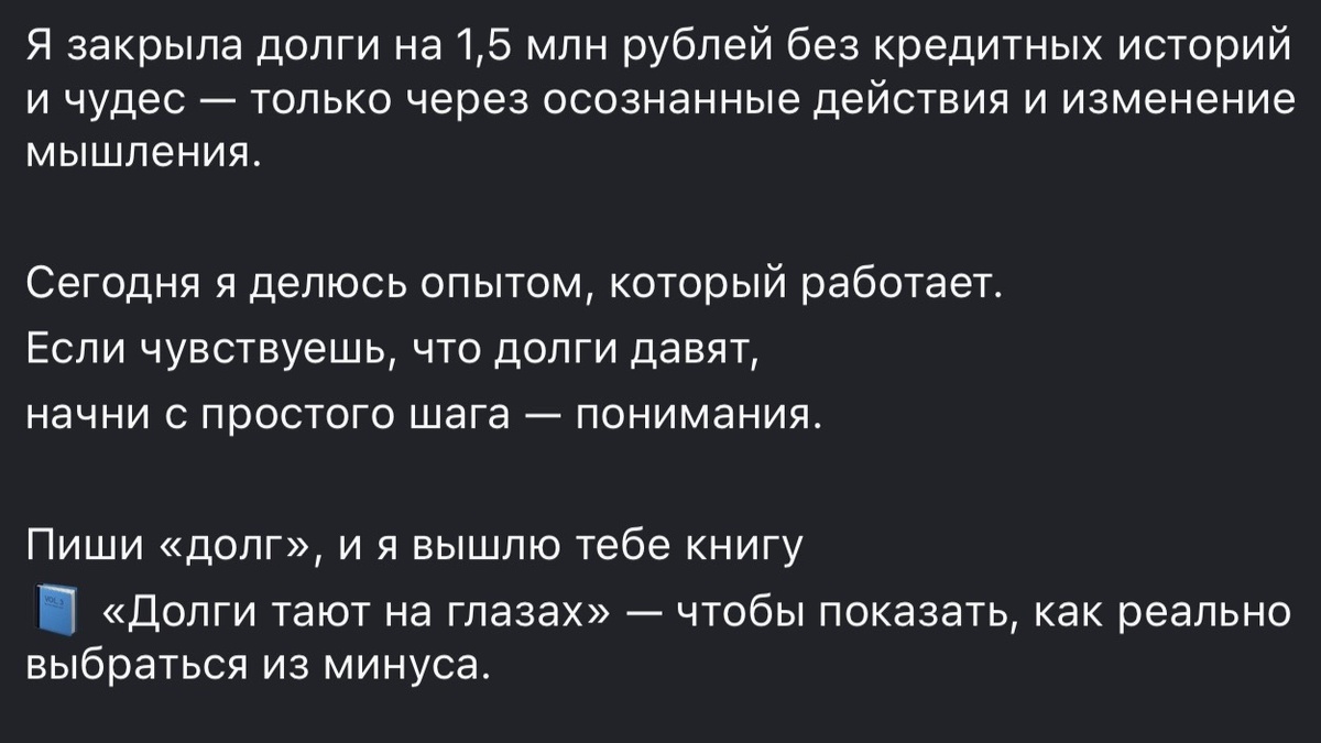 Блогер, за которым вы следите или незнакомый профиль с горящими глазами рассказывает, как выбрался из финансовой ямы: «У меня было 3 миллиона долгов, но я нашел выход» или «Как я выплатила 20 кредитов за 6 мес» — пишут они, а в описании поста уже предлагают курс, таблицу или секретную стратегию.
