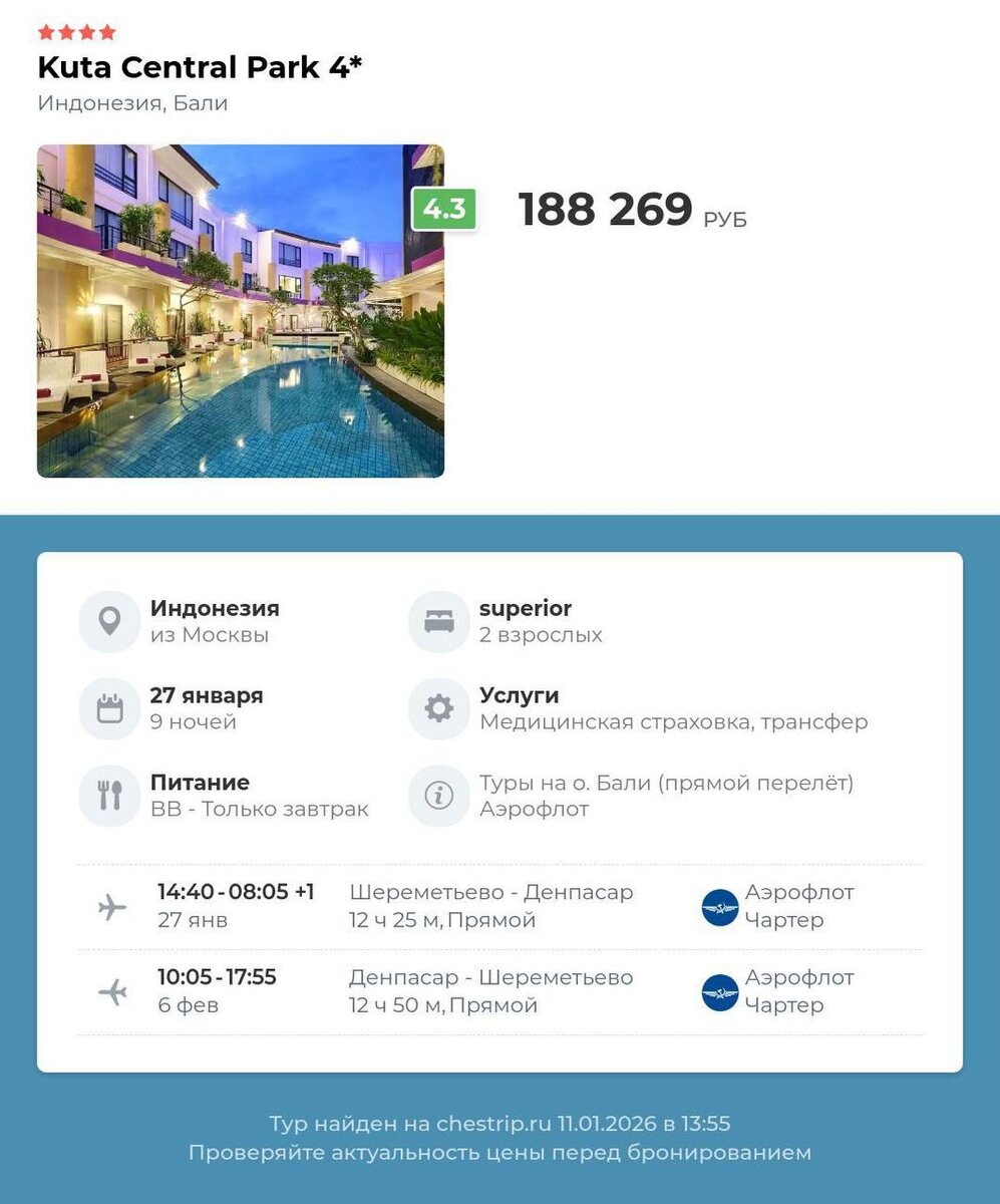 🏠 KUTA CENTRAL PARK 4⭐️ ✈️ Москва ➡️ Индонезия, Бали 📅 27 янв, 🌙 9нч 🛌 superior, 2взр 🍽 BB 🏷️ 188 269 руб 🏠 SANUR RESORT WATUJIMBAR (EX. SWISS-BELRESORT WATU JIMBAR) 4⭐️ ✈️ Москва ➡️ Индонезия, Бали 📅 27 янв, 🌙 9нч 🛌 deluxe jacuzzi king, 2взр 🍽 BB 🏷️ 212 555 руб 🏠 MERCURE RESORT SANUR 4⭐️ ✈️ Москва ➡️ Индонезия, Бали 📅 27 янв, 🌙 9нч 🛌 deluxe, 2взр 🍽 BB 🏷️ 226 458 руб 🏠 COURTYARD BY MARRIOTT BALI SEMINYAK 5⭐️ ✈️ Москва ➡️ Индонезия, Бали 📅 5 фев, 🌙 9нч 🛌 deluxe, 2взр 🍽 BB 🏷️ 262 889 руб 🏠 OBEROI BALI ✈️ Москва ➡️ Индонезия, Бали 📅 5 фев, 🌙 9нч 🛌 luxury lanai garden view, 2взр 🍽 BB 🏷️ 424 526 руб Подробнее здесь: https://chestrip.ru/поиск-туров/#tvcartid=60893789 📱 Для подбора и бронирования пишите в What’s App или Telegram 👉Бот для подбора тура👈 #турагентство #путешествие #отпуск #Индонезия #Бали
