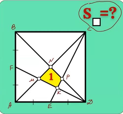 Рассмотрим решение задачи, для которой на канале Валерия Казакова приведены два способа решения. Это полезно посмотреть по ссылке. А мы обсудим третий способ решения задачи с дополнительными построениями и с минимальными вычислениями. 1. В квадрате ABCD точка E – середина стороны AD, точка F – середина стороны AB. Диагонали квадрата пересекают отрезки CE и DF в точках M, N, P, K, как показано на рисунке. Площадь четырёхугольника MNPK равна 1. Найдите площадь квадрата ABCD. На канале показано обоснованное решение задачи двумя способами. Вот итоговый кадр по первому способу решения задачи. Источник. Китайский ужас! Переводной экзамен из 8 кл. | Наглядная геометрия | Дзен Приведём ещё один способ решения задачи. Решение. Треугольники ADF и DCE равны по двум катетам (AD = CD и AF = DE), следовательно, углы ADF и DCE равны. В треугольнике CDE сумма углов C и E равна 90°, следовательно, в треугольнике DKE сумма углов D и E равна 90°, а угол K прямой. Через точки A, B, C проведём прямые, пар