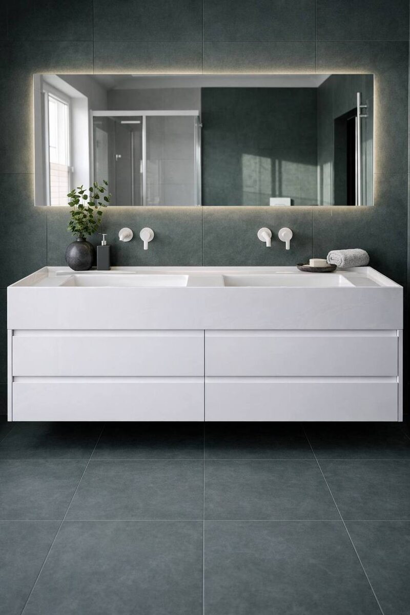 Тумба под две раковины спроектирована с учётом планировки и точных размеров помещения. Фасады с интегрированной ручкой формируют ровную, спокойную линию и поддерживают ощущение порядка. Система хранения продумана так, чтобы в ежедневном использовании всё было на своих местах без перегруженности и лишних деталей. Зеркало с встроенной подсветкой завершает композицию, формируя ровный, мягкий свет и подчёркивая материалы. 😍
