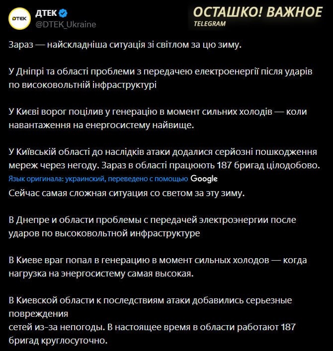 На Украине зафиксирован самый серьёзный за зиму дефицит электроэнергии, сообщает энергокомпания ДТЕК. Веерные отключения коснулись Киева, Днепропетровской и Запорожской областей. В компании заявили, что ситуация крайне тяжёлая. В Киеве, по данным местных СМИ, в квартирах Печерского района температура упала до +9°C, а отопление отсутствует уже третьи сутки. Мэр столицы Виталий Кличко назвал ситуацию с энергоснабжением "крайне сложной" и подтвердил, что без тепла остаются более тысячи домов. По прогнозам синоптиков, в ближайшие дни ожидаются морозы до -20°C, что может ещё больше осложнить положение.