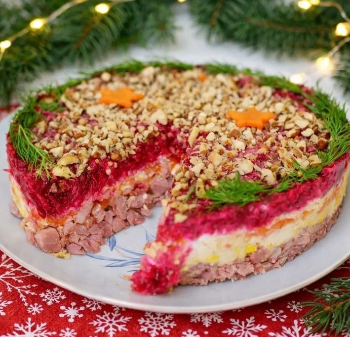 ВЫГЛЯДИТ ПРОСТО, А ВКУС — ГЛУБОКИЙ, МЯГКИЙ И ОЧЕНЬ ДОМАШНИЙ. САЛАТ «ГЕНЕРАЛ» — СЫТНЫЙ, НАСЫЩЕННЫЙ И ОЧЕНЬ ГАРМОНИЧНЫЙ ИНГРЕДИЕНТЫ: ✅ Копчёная индейка — 500–600 г ✅ Яйца — 4 шт. ✅ Морковь — 3 шт. ✅ Свёкла — 1–2 шт. ✅ Твёрдый сыр — 100 г ✅ Чеснок — 2–3 зубчика ✅ Грецкие орехи — 60 г ✅ Майонез — около 250 г ✅ Зелень — для украшения ПРИГОТОВЛЕНИЕ: 1. Морковь и свёклу отварить до мягкости, остудить и обсушить. Яйца отварить вкрутую, очистить. 2. Яйца натереть на мелкой тёрке. Морковь, сыр и свёклу натереть на крупной тёрке. Свёклу при необходимости слегка отжать от сока. 3. Копчёную индейку нарезать мелкими кусочками. Добавить измельчённый чеснок и 2–3 ст. л. майонеза, перемешать. 4. Салат собрать слоями, слегка промазывая каждый майонезом: • Копчёная индейка с чесноком • Яйца • Морковь • Сыр • Свёкла 5. Верх салата аккуратно выровнять. Посыпать измельчёнными грецкими орехами, сделать тонкую сеточку из майонеза и украсить зеленью. 6. Убрать салат в холодильник минимум на 2
