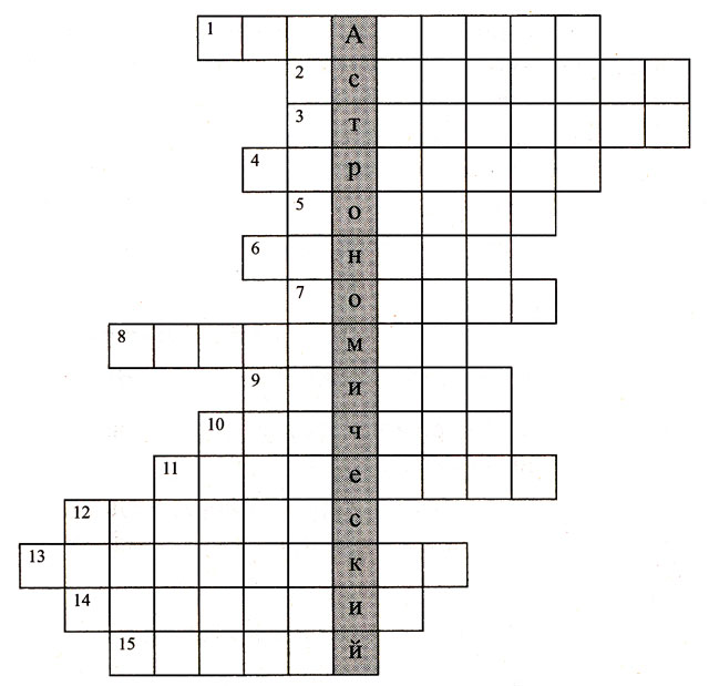 1. Гигантское скопление звезд, планет, газов, пыли, образующее что-то типа острова, медленно вращающегося в космическом пространстве. 2. Звездоподобные планеты, малые тела Солнечной системы. 3. Океан воздуха, окружающий Землю и имеющий в высоту несколько сотен километров. 4. Самая маленькая планета, ближе всех расположенная к Солнцу. 5. Часть атмосферы Солнца, простирающаяся на миллионы километров. 6. Эта планета Солнечной системы носит имя богини красоты и любви, самая яркая планета, затмевающая своим блеском все звезды. 7. Небесное тело небольших размеров, состоящее из замороженной воды и газа вперемешку с частицами пыли и камней. Движется вокруг Солнца по вытянутой орбите и имеет «хвост». В древности их называли «хвостатыми чудовищами». 8. Выдающийся греческий-ученый античности, создатель теории неба (II в. н. э.). 9. Планета-гигант, названа в честь бога Олимпа, повелителя молний. Она в сотни раз больше Земли и окружена 16 спутниками. 10. Туманные пятна на звездном небе из скоплен