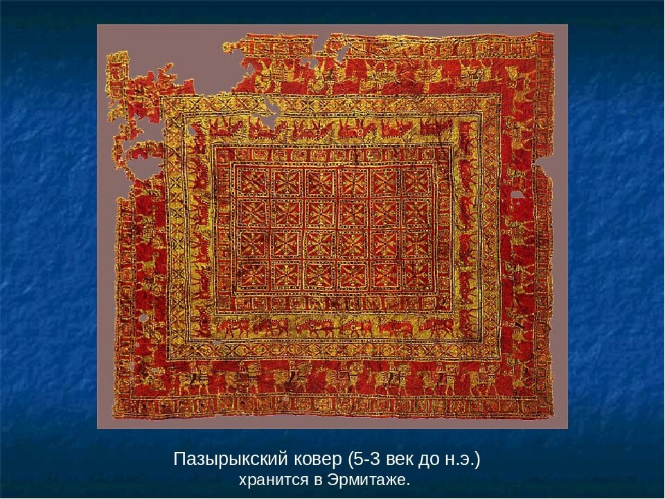 Кто и когда впервые стал делать ковры в привычном нам понимании, неизвестно. Но мы точно знаем, что к V веку до нашей эры люди уже занимались этим ремеслом. В 1949 году во время раскопок на Алтае археологи нашли шерстяной узелковый ковер, созданный в железном веке представителями пазырыкской культуры. Она и дала название этому артефакту. Сейчас Пазырыкский ковер выставлен в Эрмитаже. Он до сих пор сохранил яркость красок, а его рисунок наполнен сложным символизмом (грифоны олицетворяют необузданную силу, олени — благородство, а всадники, движущиеся против часовой стрелки — особое предназначение и визионерство). Представители пазырыкской культуры были кочевниками, и именно кочевые народы стали первыми производителями и ценителями ковров — для них это был предмет первой необходимости, заменявший собой и пол, и постель, и диван, а порой и стены жилища. Американская компания Woven Legends делает копии Пазырыкского ковра. Дизайн, придуманный давно ушедшей культурой сотни лет назад, выгл