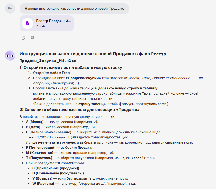 Часто в организациях используются таблицы, которые ведутся очень долго, то есть возникает необходимость передавать таблицу от одного исполнителя к другому. Писать инструкцию к таблице в excel не просто. Во-первых, сам процесс долгий и трудоемкий, нет времени им заниматься, во-вторых, специалист может просто отказаться от этого, сказать сами разбирайтесь, в-третьих, там всегда много мелочей, что понятно одному, не всегда очевидно другому, инструкция, написанная опытным сотрудников, может быть не понятна новичку. Помочь в работе с инструкциями может GPT. Для этого пишем простой промт и прикрепляет файл с таблицей для которой нужна инструкция Данный ответ можно использовать для проверки работы с файлом и написания инструкции. GPT можно даже попросить привести пример строк таблицы на конкретном примере Если инструкция по файлу для нового сотрудника, бывает достаточно сложно вспомнить все нюансы на которые нужно обратить внимание, чтобы минимизировать ошибки. Опытный сотрудник выполняет
