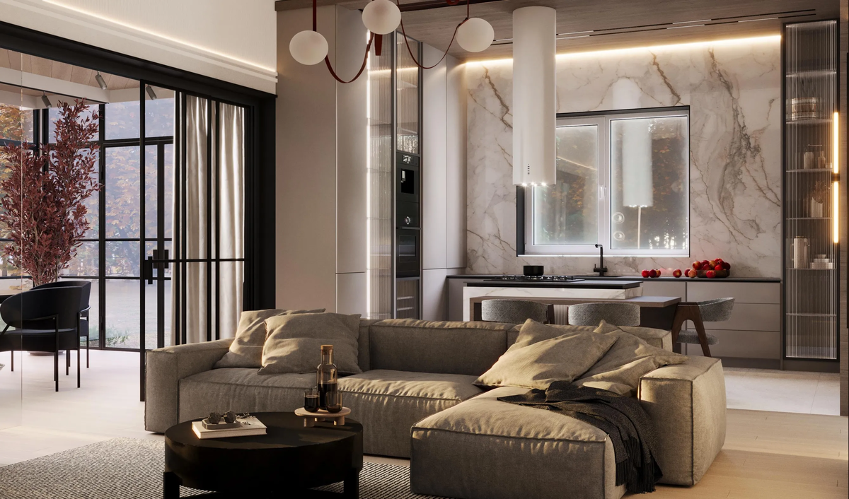 Мраморные поверхности на кухне создают ощущение роскоши, при этом оставаясь практичными. Акцентная стена с натуральным рисунком мрамора придаёт глубину и визуальный интерес. Мягкий модульный диван нейтрального серого оттенка предлагает зону для отдыха и общения, гармонично вписываясь в общий стиль помещения.